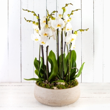 A stunning large bowl full of amazing white orchids perfect for making a statement.