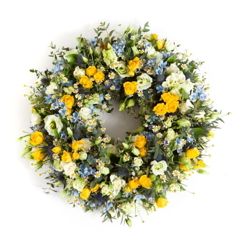 A beautifully crafted wreath featuring seasonal yellow, white, and soft blue blooms, designed by our expert florists. The warm glow of yellow flowers contrasts elegantly with fresh white and delicate blue tones, creating a tribute that is both uplifting and serene. Arranged in our signature natural, loose style with soft foliages, this striking piece offers a heartfelt expression of remembrance and celebration of life.
