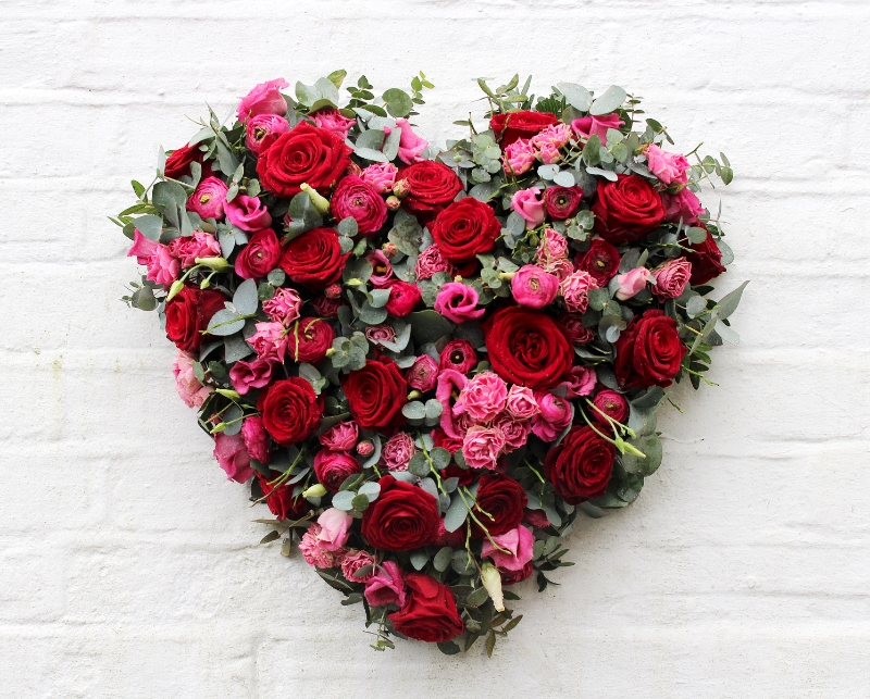 A stunning heart full of flowers including roses in your colour choice. This is a true statement of love.