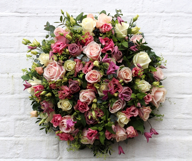 A luxurious, rose-filled posy arranged in our signature loose, garden style. Featuring an abundance of premium roses in soft pink and ivory tones, complemented by delicate seasonal foliage, this elegant tribute expresses love, admiration, and remembrance beautifully.