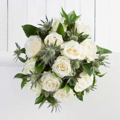 Luxurious, stunning white roses in a full bouquet with complimenting foliage and flowers. Perfect for a simple, elegant statement.
