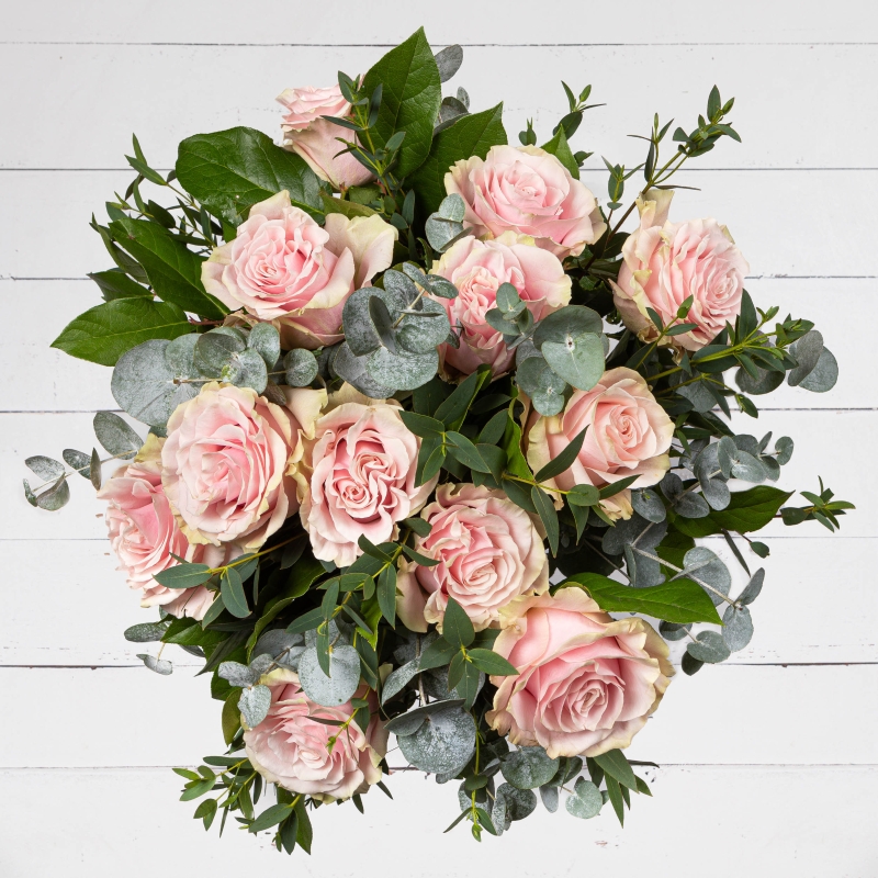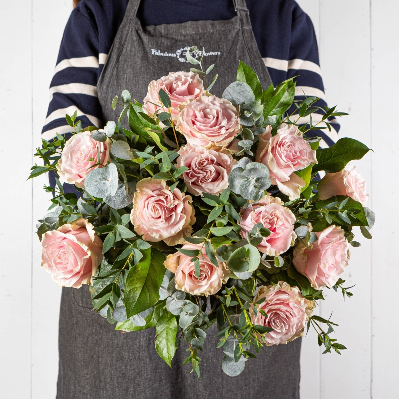 A very pretty, soft bouquet of blush pink roses with complimenting foliage and flowers.