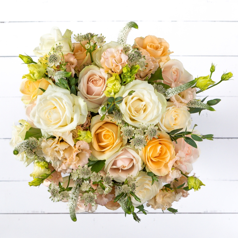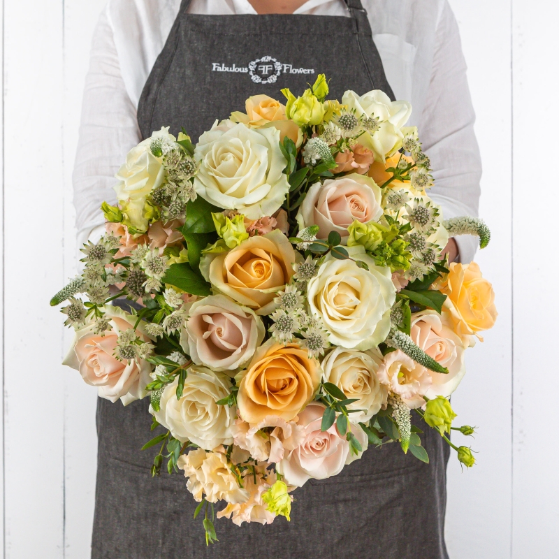 Dare to go bare with this sensuous arrangement of creamy whites, soft blushes, and warm peach tones. Featuring voluptuous roses, delicate lisianthus, and playful astrantia, this bouquet is as enticing as it is elegant. Perfect for when you want to make a statement with subtle sophistication—or simply leave them blushing.