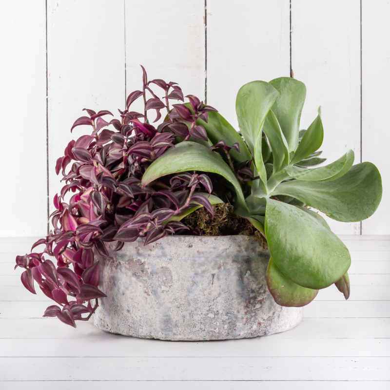 A fabulous rustic style bowl filled with succulent style easy care plants