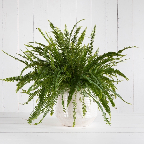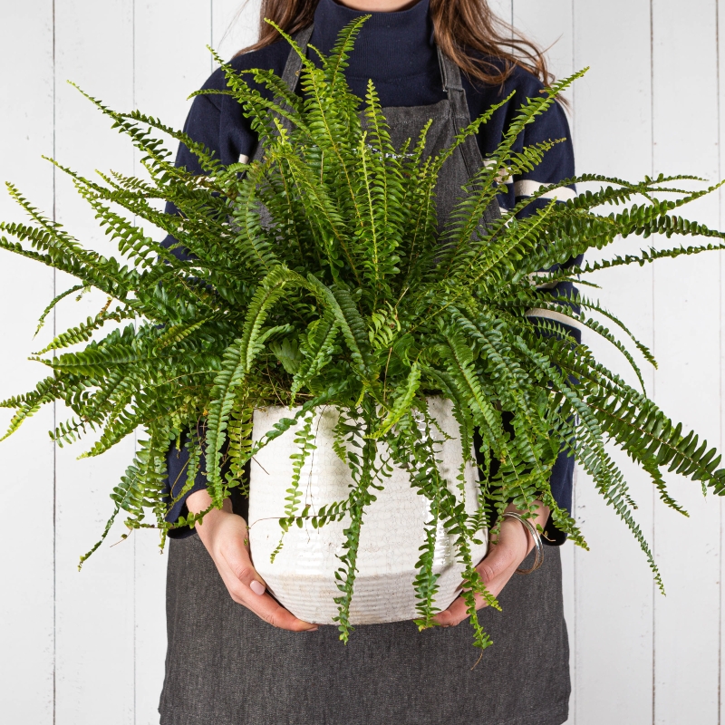 A stunning Large Boston Fern in a neutral, textured pot. This is a real statement plant for a home or office