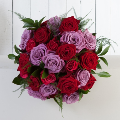 A luxurious, romantic rose bouquet of red and Purple roses with lush green foliage.