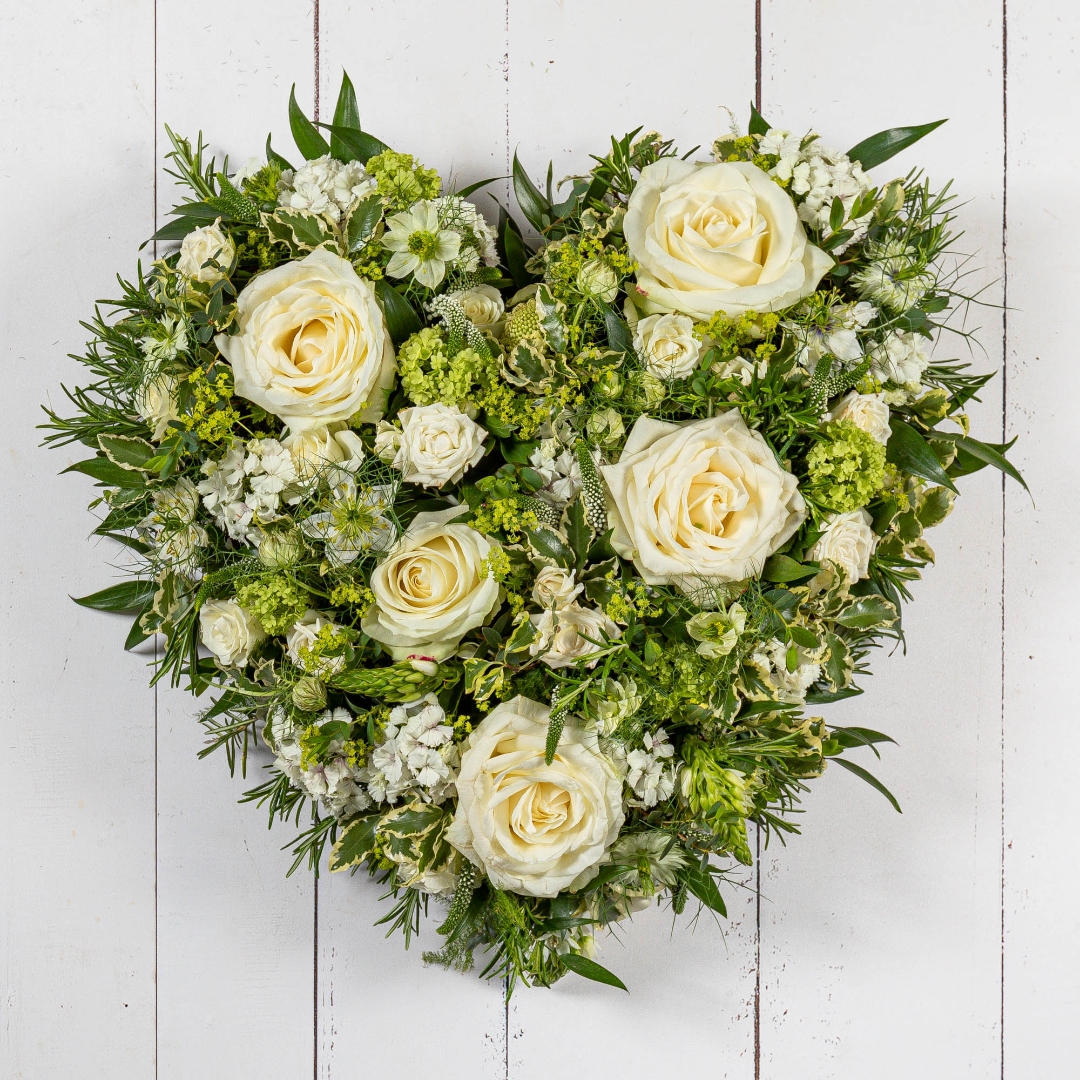A stylish, Elegant floral heart in all seasonal white flowers including roses naturally arranged with soft complimentary foliage. The base is made from Floral fibre, A natural product based on volcanic basalt rock with a bio-based binder that is derived from rapidly renewable materials and a recyclable & compostable card base.