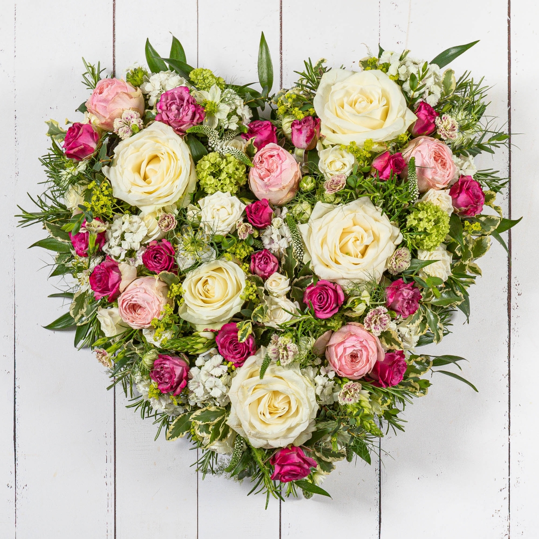 A stylish, Elegant floral heart in all seasonal white and pink flowers including roses naturally arranged with soft complimentary foliage. The base is made from Floral fibre, A natural product based on volcanic basalt rock with a bio-based binder that is derived from rapidly renewable materials and a recyclable & compostable card base