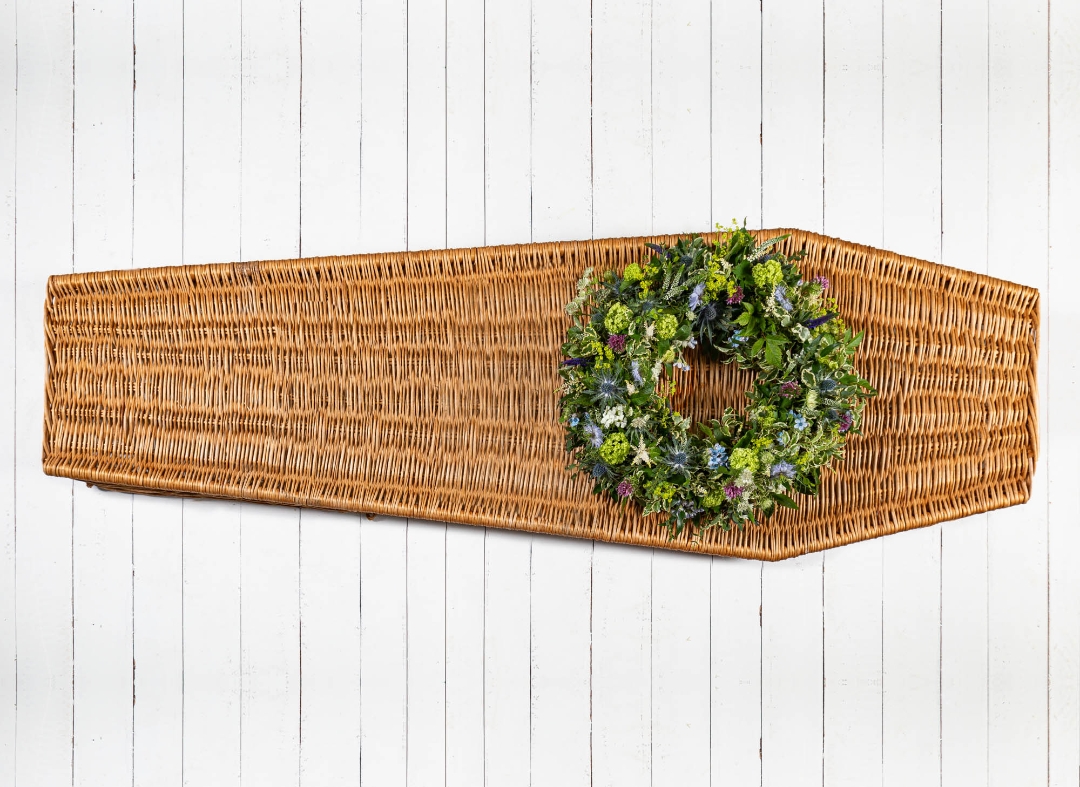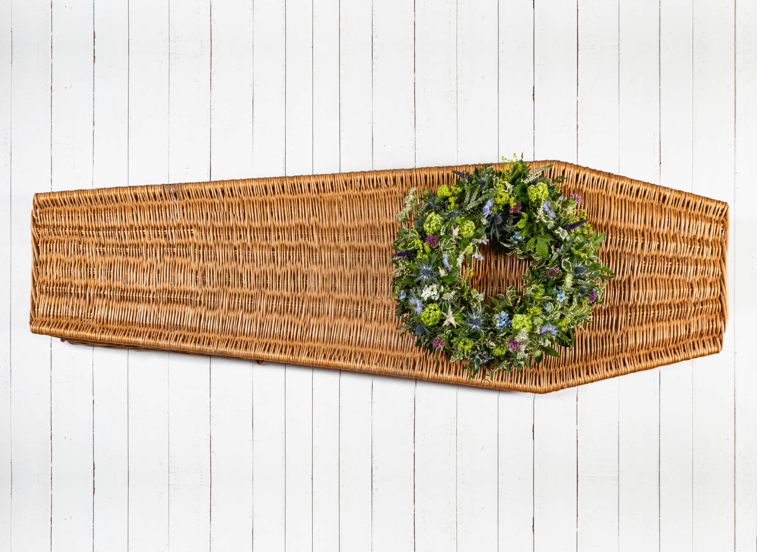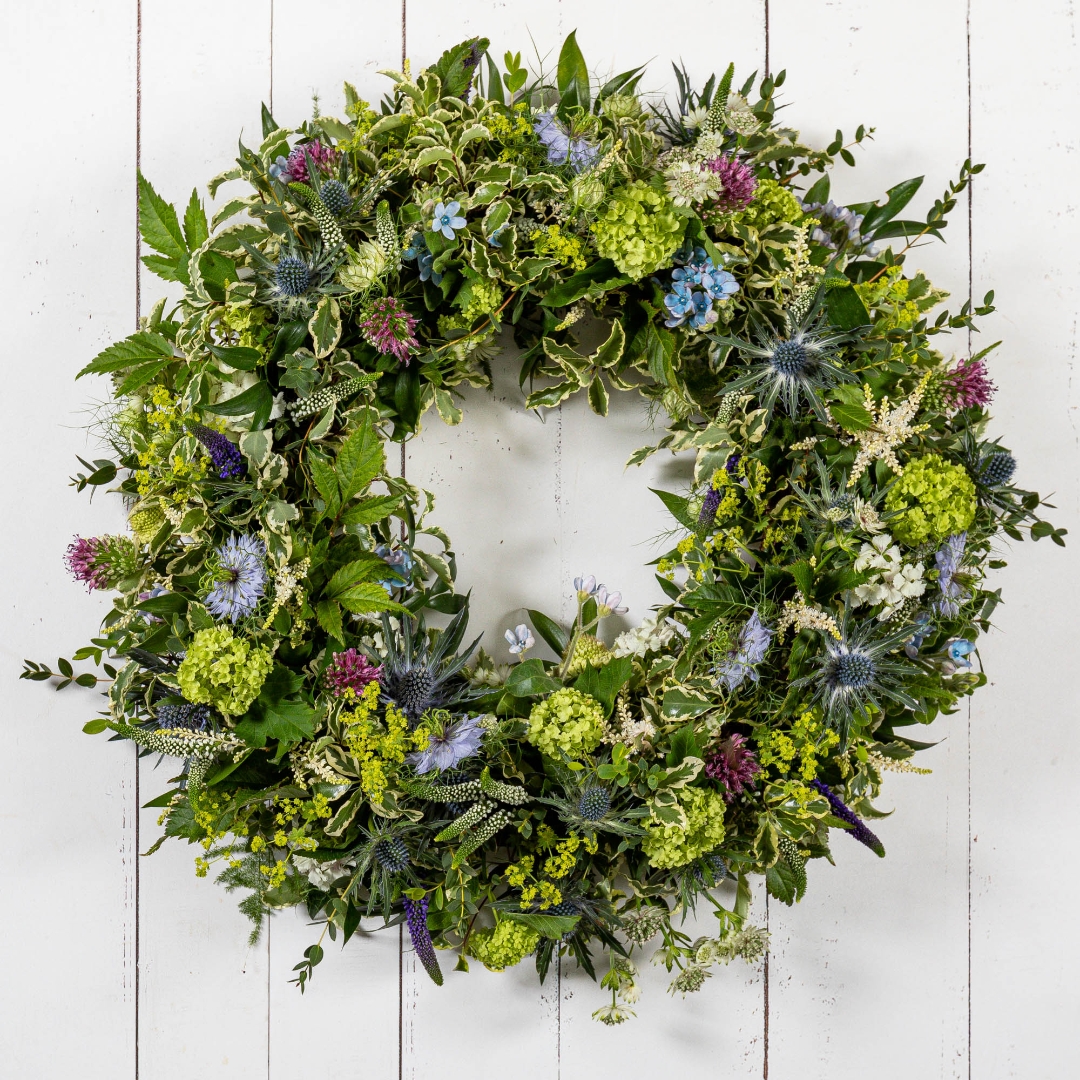 A wild, woodland style wreath in all seasonal flowers naturally arranged with soft complimentary foliage. The base is made from Floral fibre, A natural product based on volcanic basalt rock with a bio-based binder that is derived from rapidly renewable materials and a recyclable & compostable card base