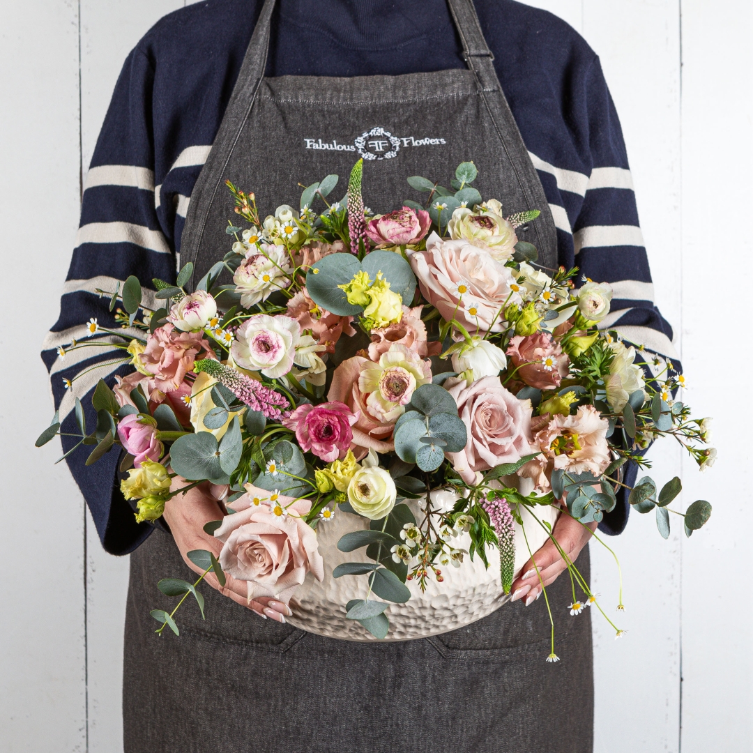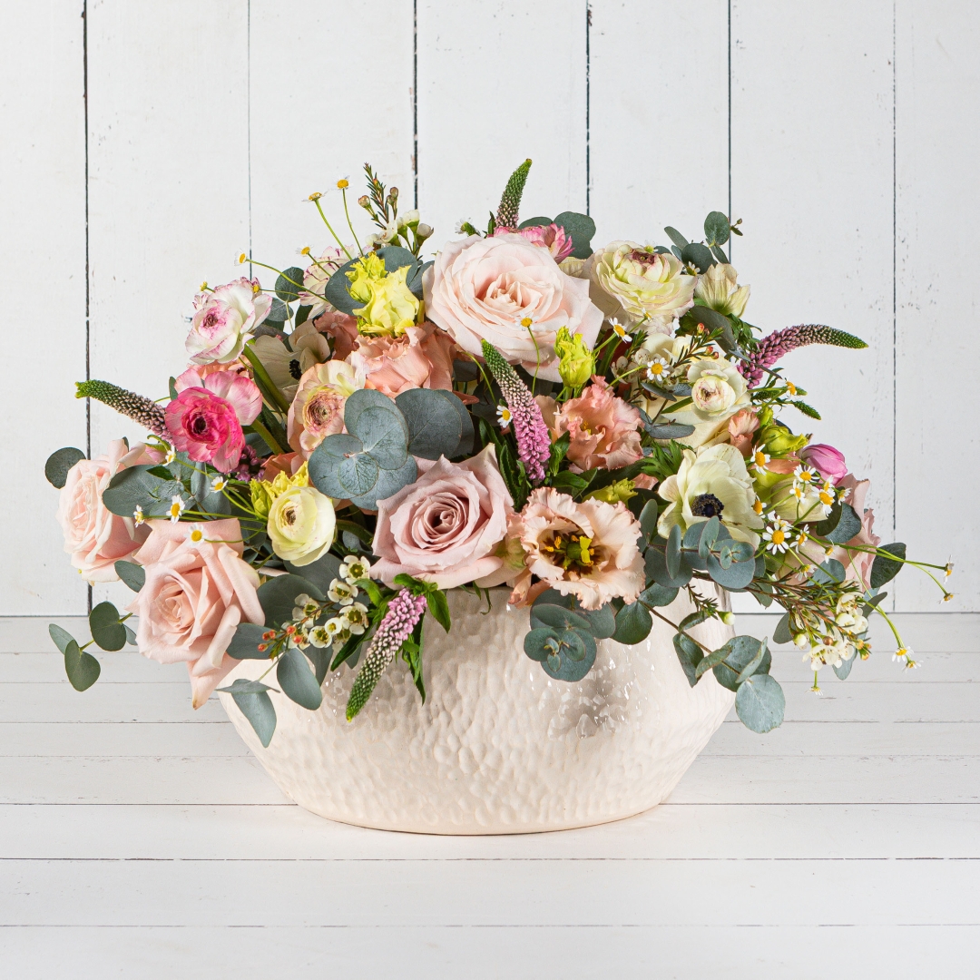 Delicate and refined, our Joyful Mum Bowl Arrangement combines soft pastel pinks and peaches, featuring roses, lisianthus, ranunculus, and Veronica, all nestled among mixed foliage. Presented in an elegant large ceramic bowl, this stunning design offers a perfect balance of beauty and warmth, making it an ideal gift for Mother’s Day, anniversaries, or any special occasion.