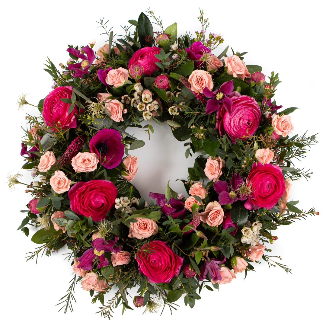 A beautifully handcrafted wreath in soft and rich pink tones, designed to offer a graceful and heartfelt tribute. Our expert florists carefully select the finest seasonal flowers to create a harmonious and timeless arrangement, conveying warmth, respect, and remembrance. We will choose the best flowers available, but if you have any favourites, please let us know, and we will be happy to discuss incorporating them.