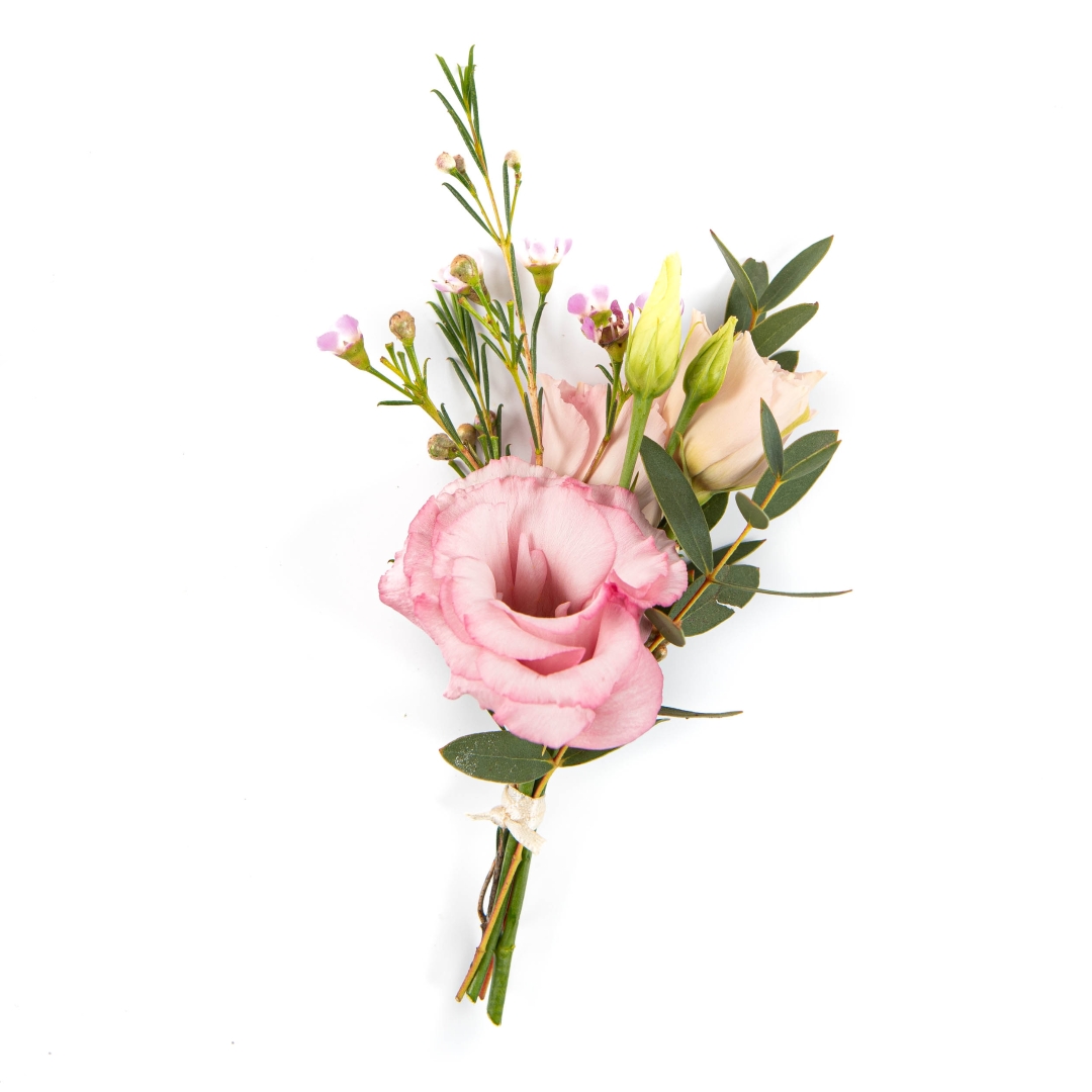 A small, decorative arrangement of flowers, typically worn on the lapel of a suit or jacket by the groom, best man, ushers, and fathers, , and attached with a provided pearl-headed pin.