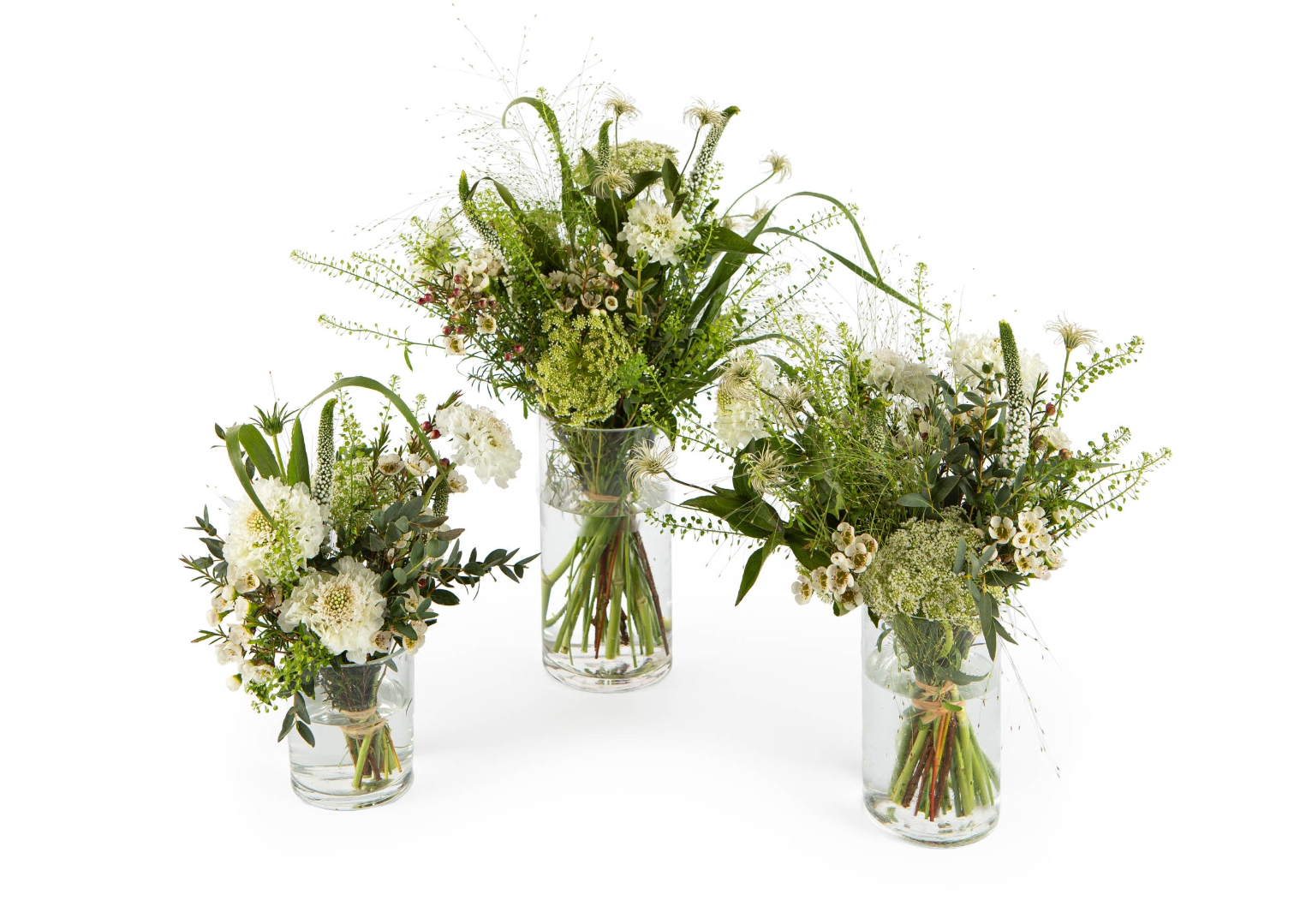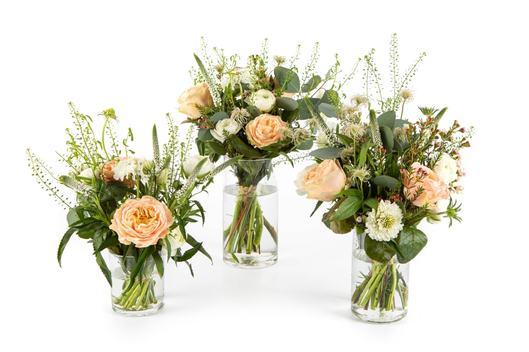 A trio of simple glass vases with hand ties of your chosen blooms.