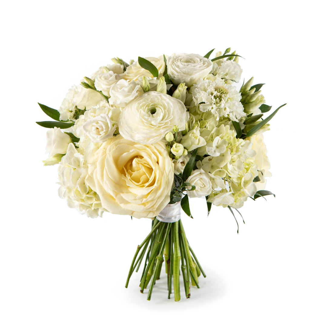 The Flowerful style bridal bouquet will have an approximate diameter of 9 inches, A sophisticated arrangement of blooms with clean lines and a neat shape, creating a lush and abundant feel.