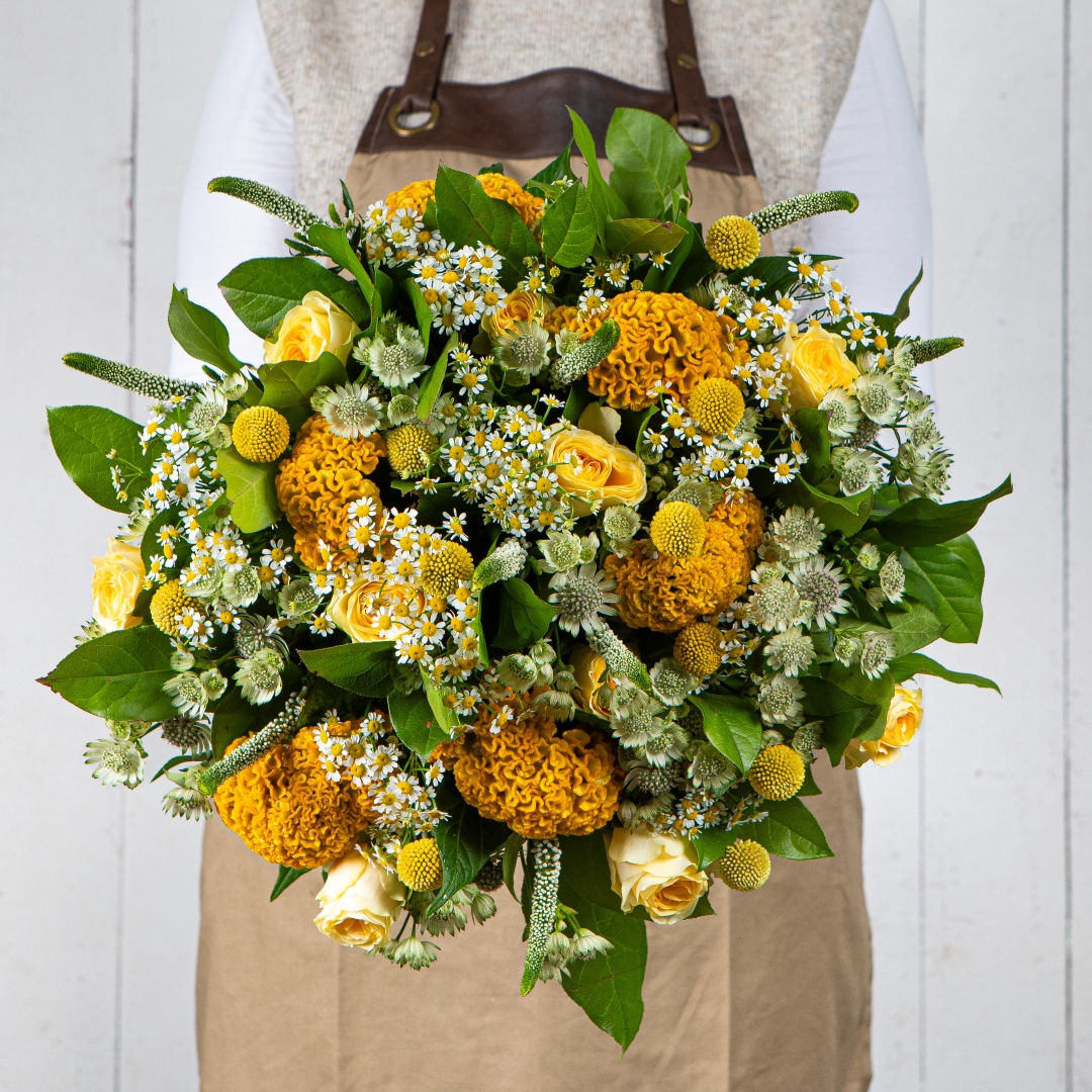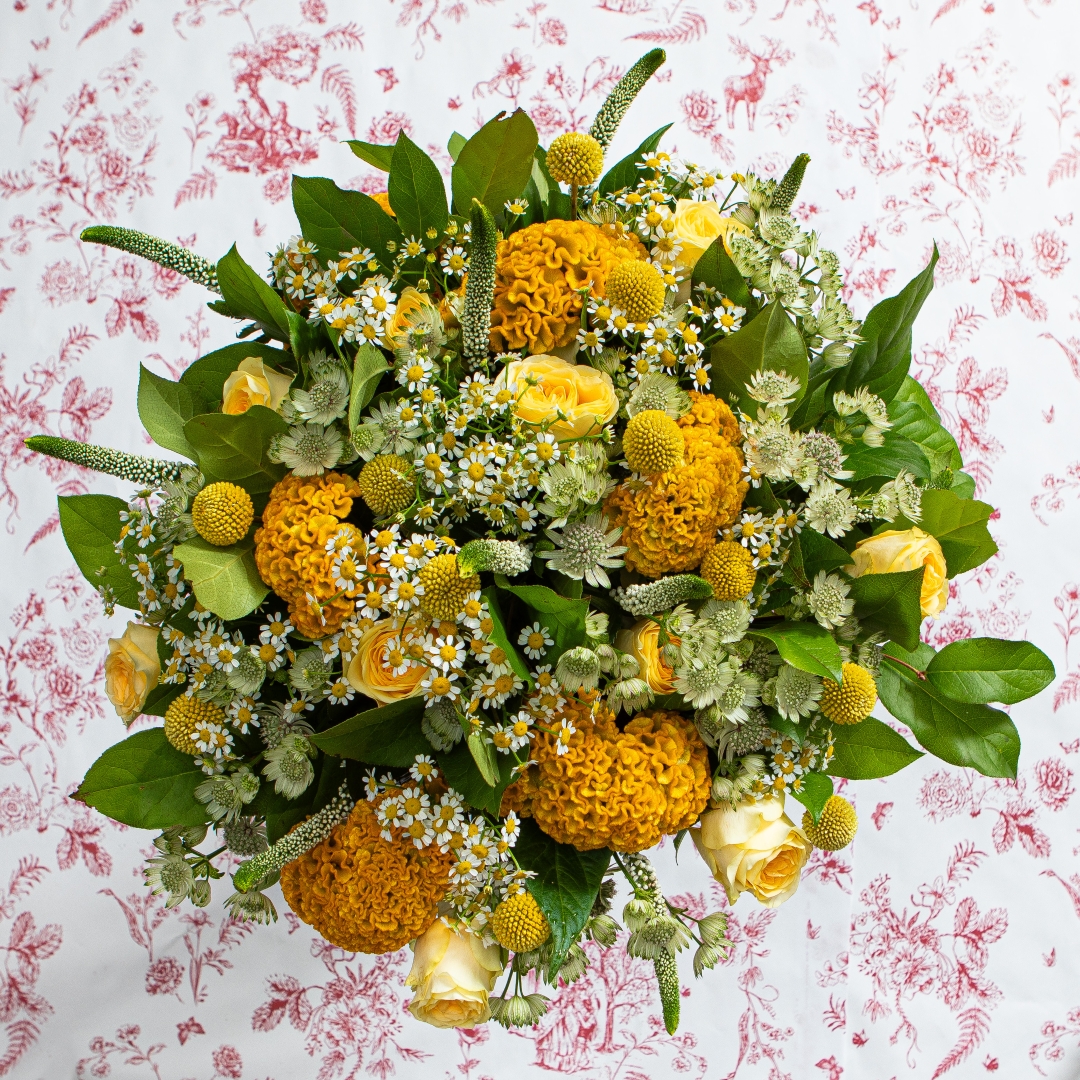 This show-stopping bouquet combines sunshine-hued yellow celosia, buttery roses, craspedia, and delicate daisies, all hand-arranged in a decadent swirl of texture and tone. It’s a modern-day confection of colour and form — lush, uplifting, and perfectly indulgent.