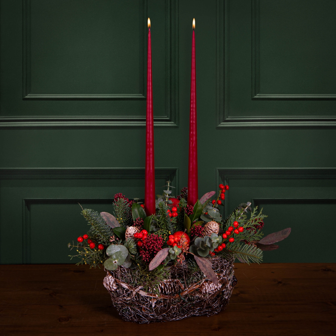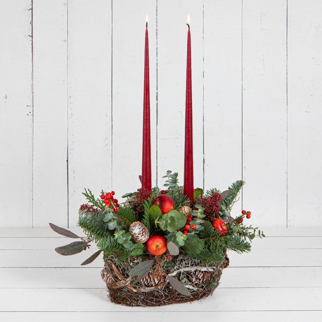 Our Rustic, Stylish container made from Branches, Cones and dried moss along with two long burn Danish Candles, Winter foliage, apples, berries and cones