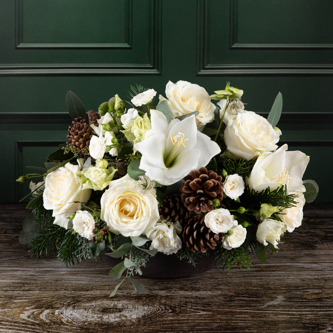 A stunning low bowl arrangement of Frosty White blooms including Amaryllis, Roses, Hydrangea with Winter foliage, berries and cones. Perfect for a large tablecentre or coffee table