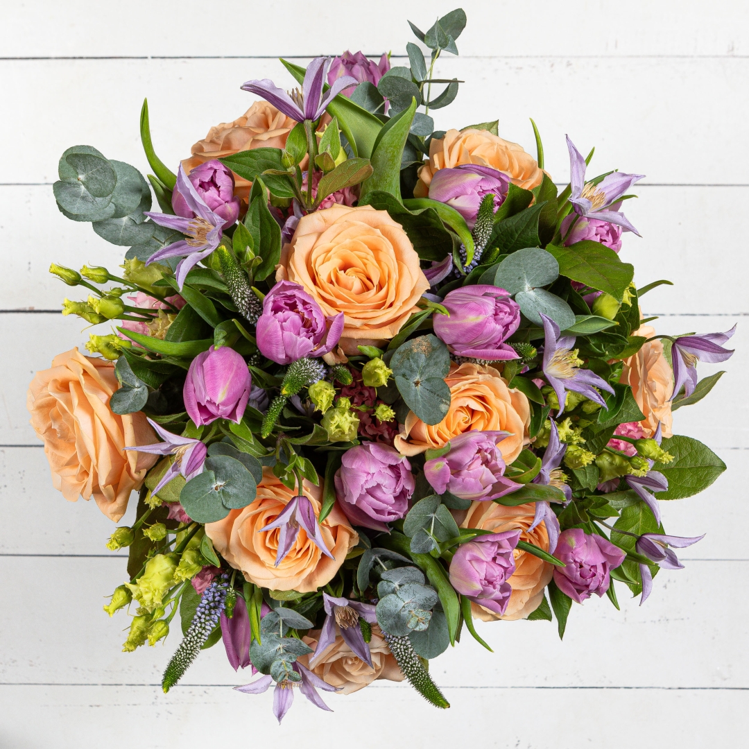 a fresh, uplifting bouquet full of soft peach roses, blousy pink tulips, delicate clematis and seasonal foliage. Designed with a relaxed, garden-gathered style, this bouquet blends warm apricot tones with gentle lilacs and fresh greens for a beautifully balanced, feel-good arrangement.