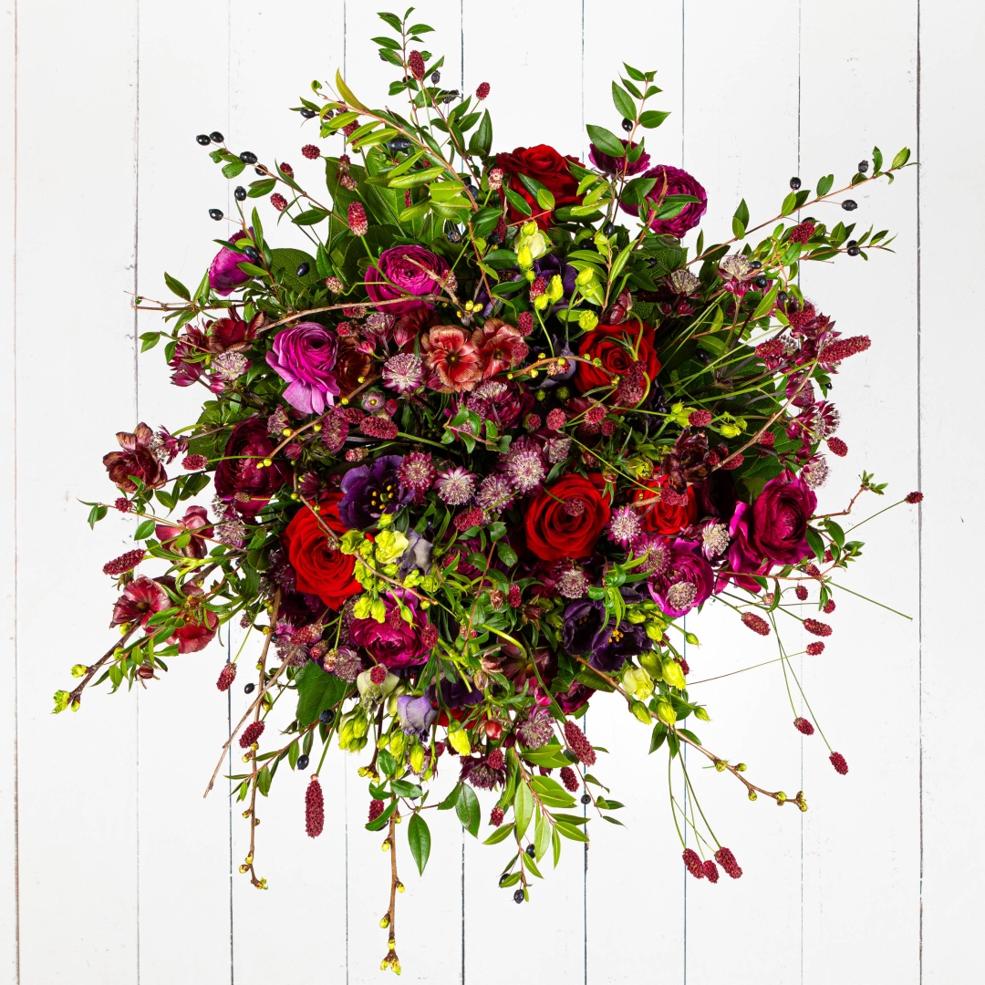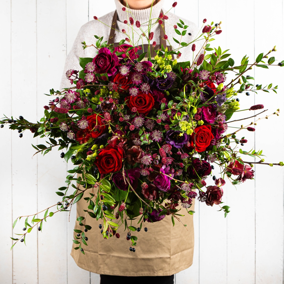 The Cotswold Weekend is inspired by time away and nowhere urgent to be. Deep reds, inky purples and textural seasonal blooms are woven together with berries, branching stems and fresh foliage, creating an abundant, natural arrangement with a sense of movement and depth. It feels generous and expressive, with just the right balance of wild and refined.