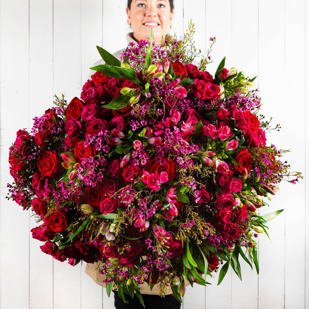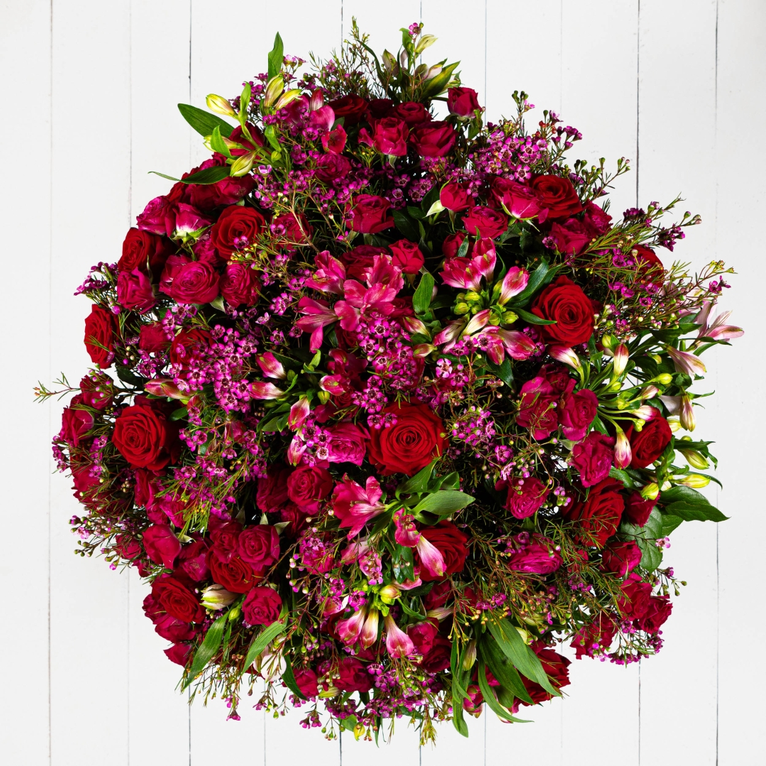 A statement bouquet of abundant crimson roses, vibrant pink alstroemeria and delicate seasonal texture, The Trailblazer is designed for the woman who leads from the front and inspires everyone around her. This is not a quiet arrangement — it’s powerful, confident and full of presence.
