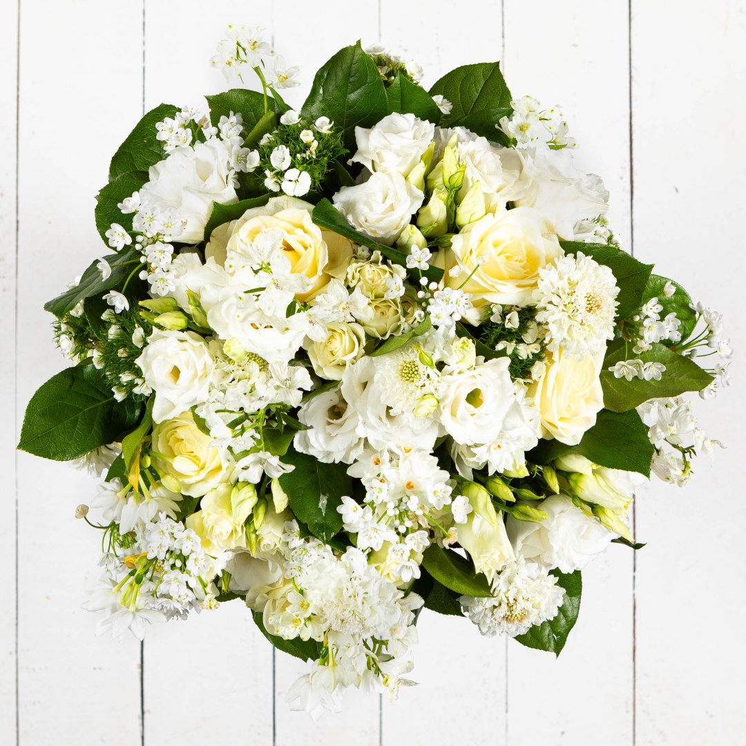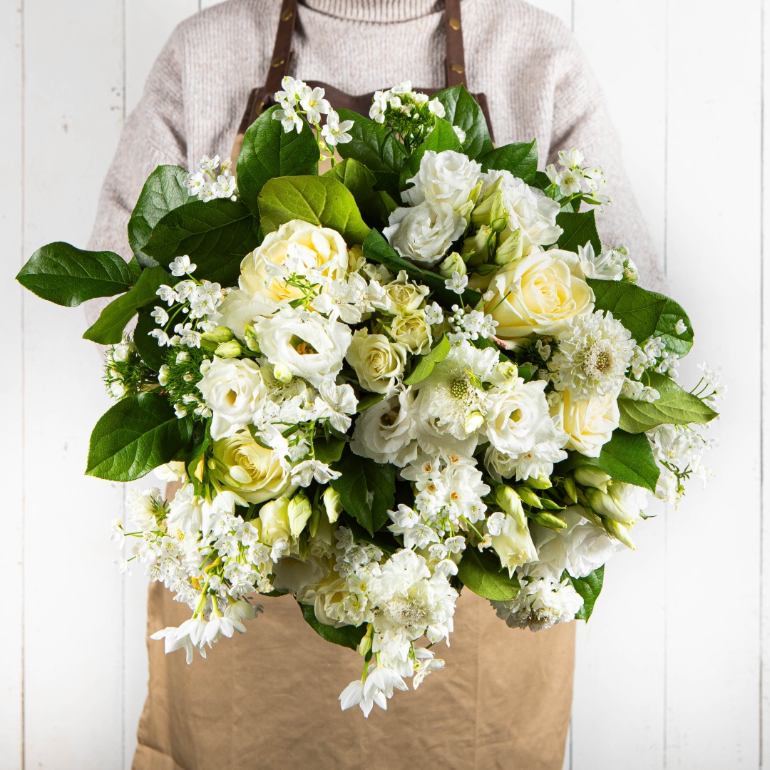 A refined blend of ivory roses, soft cream lisianthus and delicate seasonal white blooms, The Quiet Strength bouquet is designed to honour the woman whose resilience speaks for itself. Fresh green foliage frames this timeless arrangement, creating a natural, graceful silhouette full of depth and calm confidence.