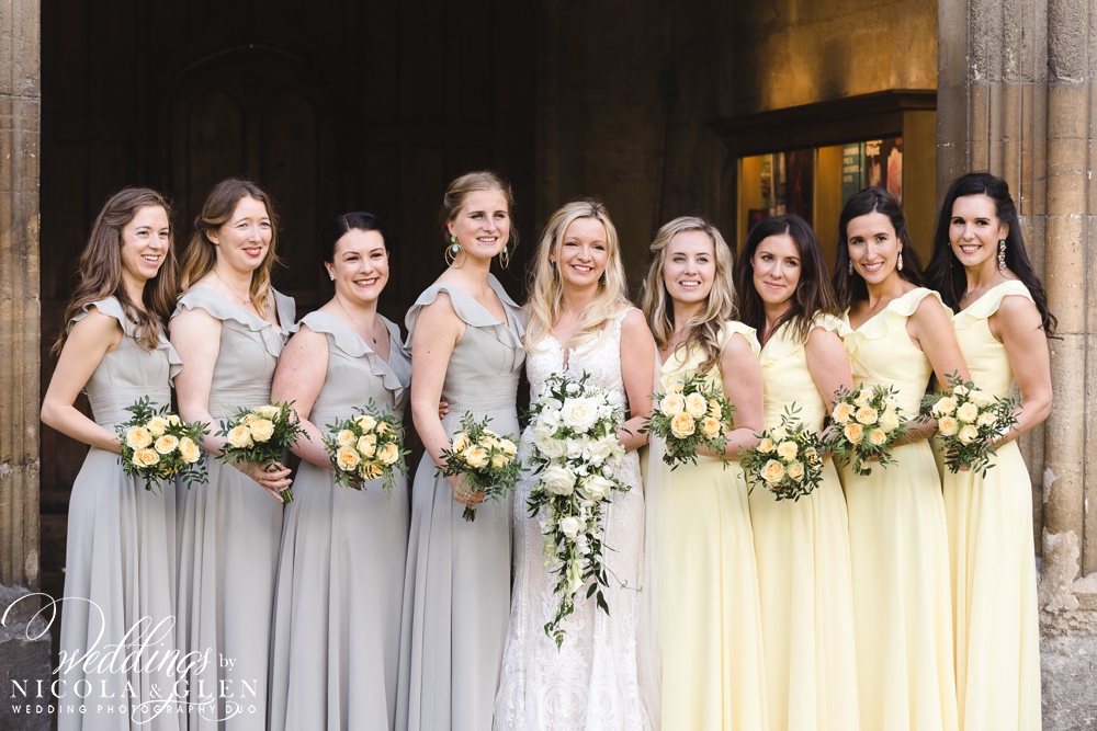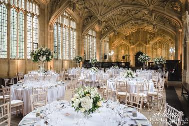 With the Bodleian library providing an effortlessly stunning backdrop as usual it is easy to make this venue look wedding ready. Low silver punch bowls and tall glass fluted vases with domes of hydrangea, buttercup roses, avalanche roses and white lisianthus completed the tables to add a variation in height throughout the Divinity School.