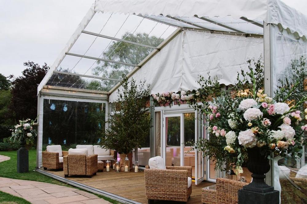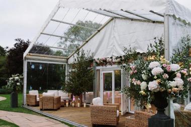 After the ceremony and wedding breakfast, drinks and dancing was held on the lawn in a grand marquee. The entrance was decorated with real cut birch trees, lanterns and a soft garland above the doorway.