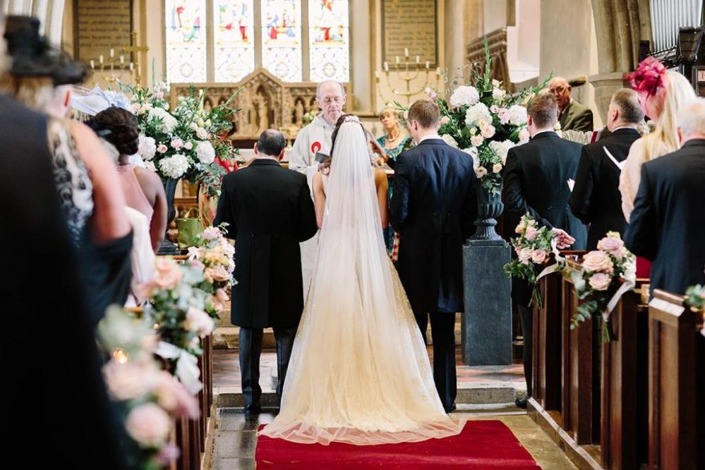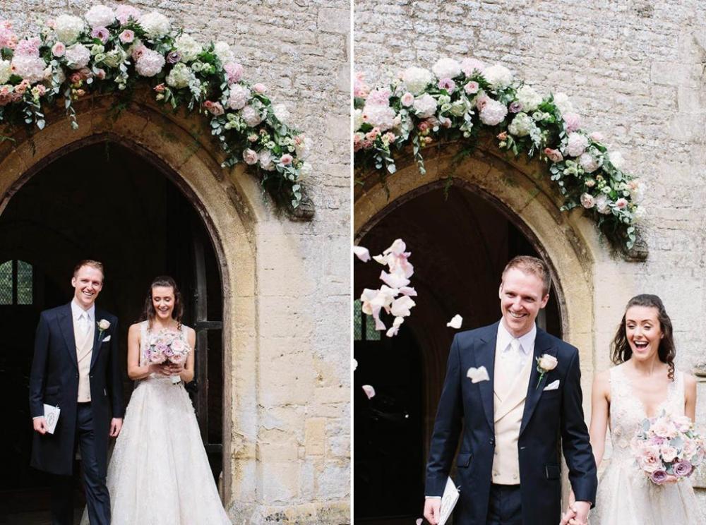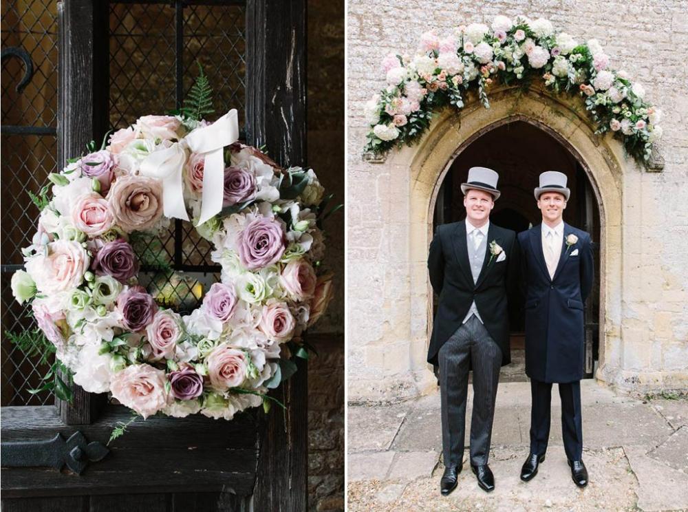 An beautiful, natural English country garden archway adored the entrance to the church and made a lovely backdrop for the confetti throwing at the end of the service. Wreaths were hung on the church gates for extra floral fabulousness.