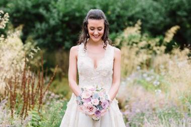 Lauren’s wedding bouquet consisted of memory lane, quicksand and bombastic roses with touches of grey dusty miller and eucalyptus. Her stunning gown had a very slight blush tone backing the lace so it was important to compliment this.
