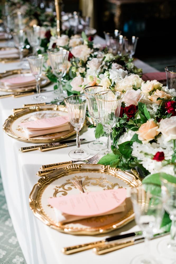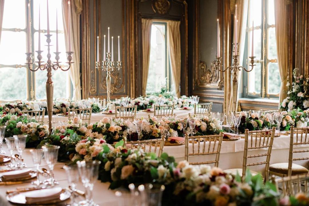 Working with Hannah from Hannah Hope Weddings we created a romantic, elegant tablescape to wow the guests. Long tables were adorned with flower runners of soft Hydrangeas and Hundreds of pastel toned roses scented stocks and soft foliage with tall gold candelabra and gold votives with tealights to create romantic flicker at different heights.
