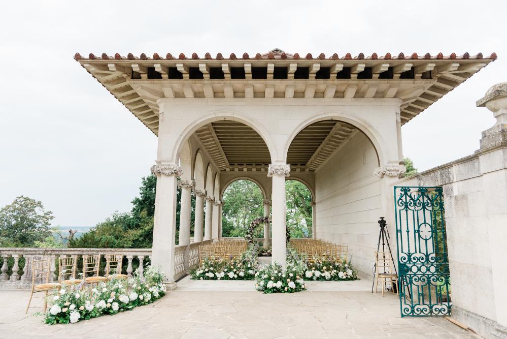 For the ceremony we designed a free standing, moongate arch completely covered in hydrangeas, roses and other garden flowers. A floral garden border ran the length of the aisle to create a dramatic entrance for the bride. This garden border was repeated to enclose the string quartet and carry the theme throughout the wedding.