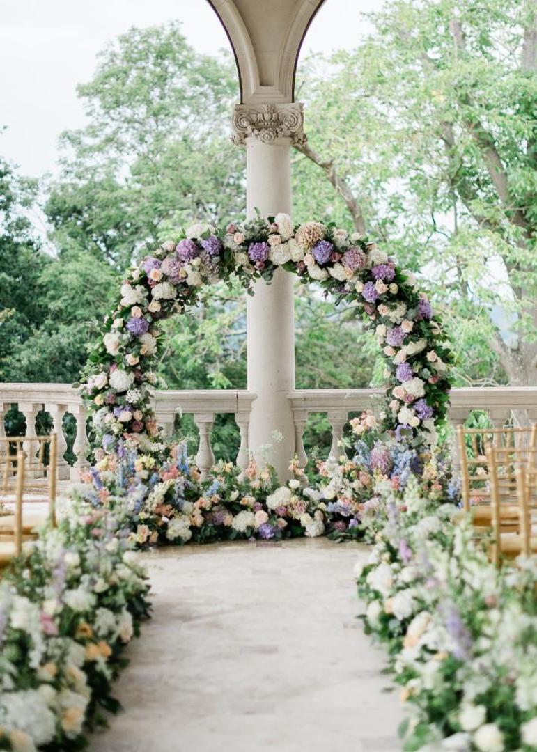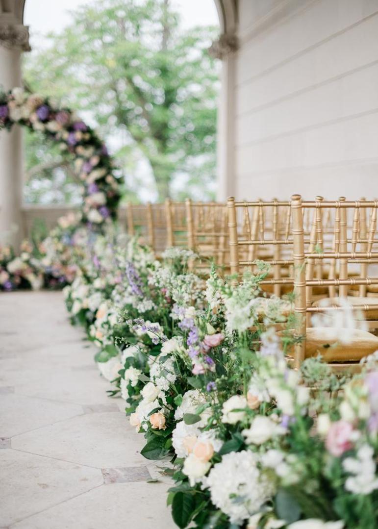 Elegant, flowerful with an English garden feel with a statment aisle in soft pastel tones.