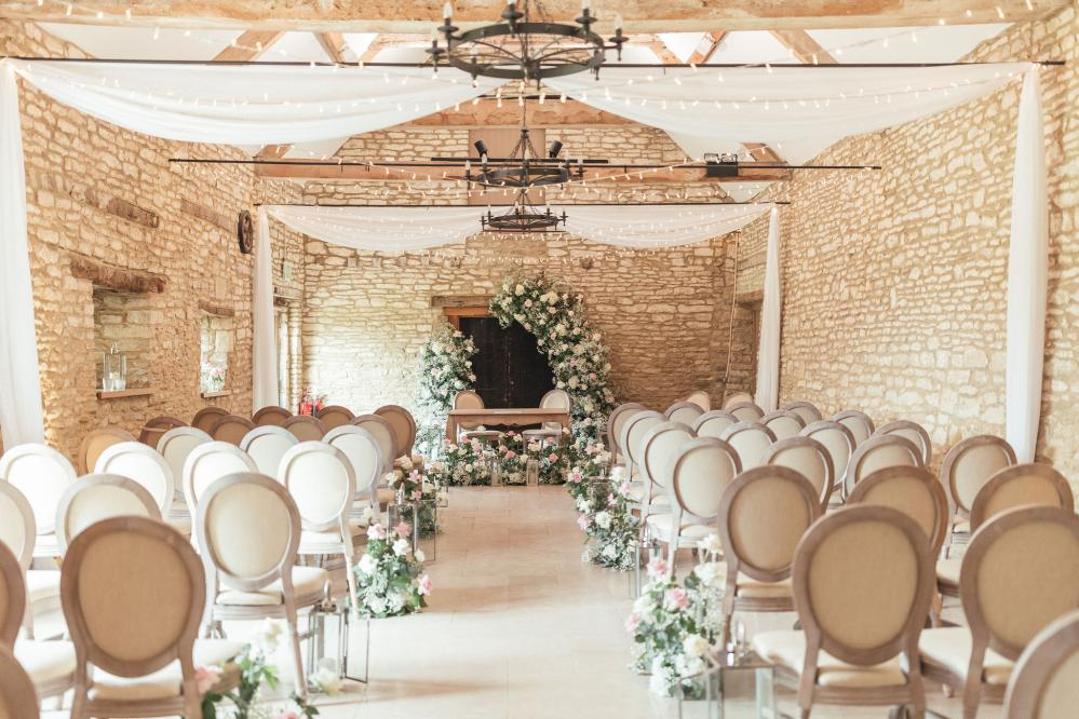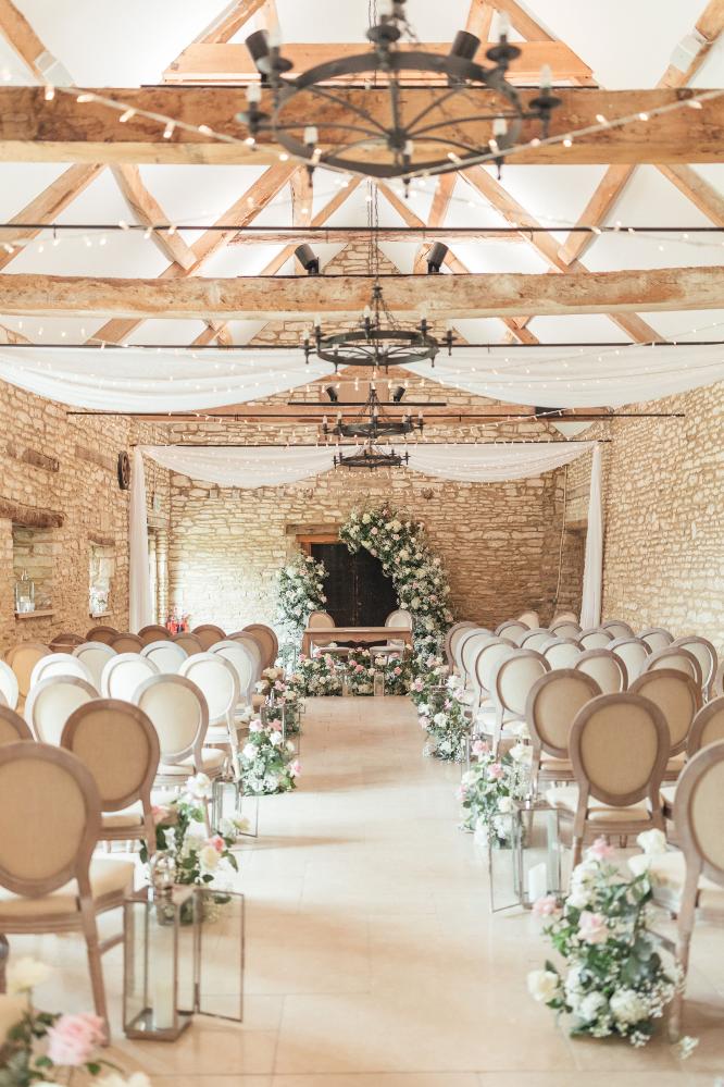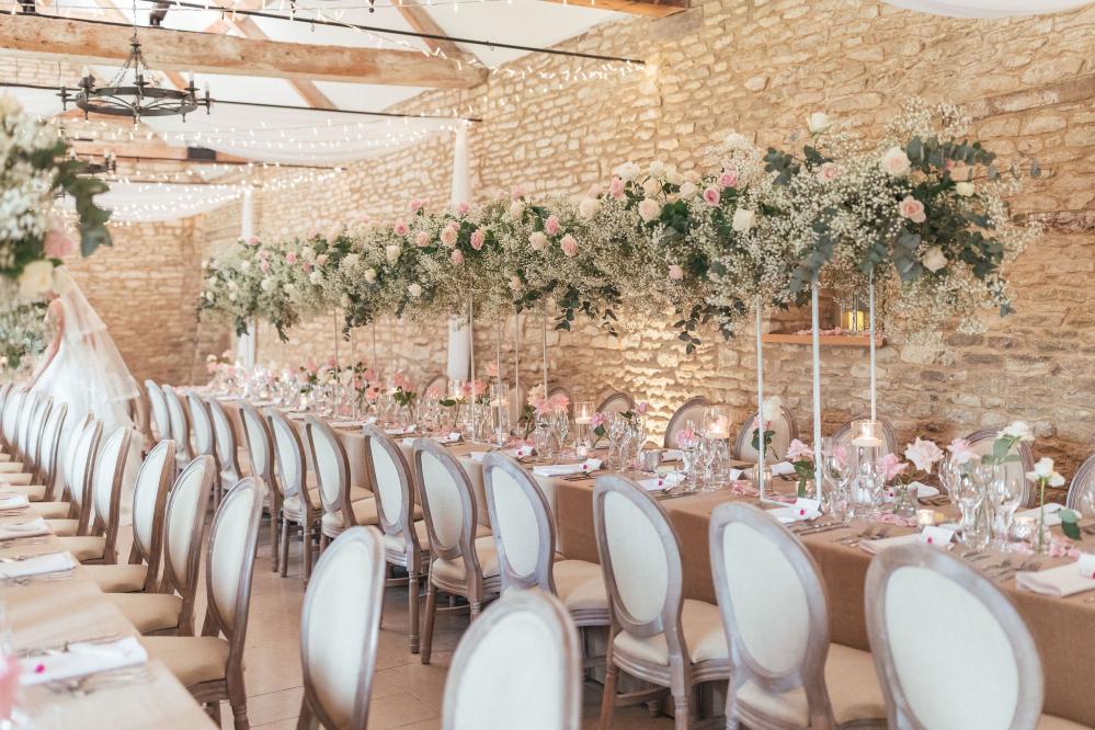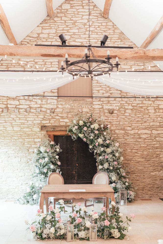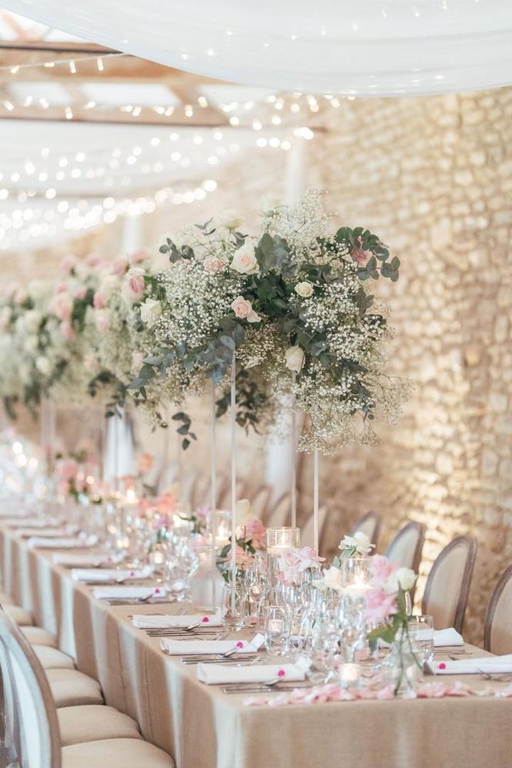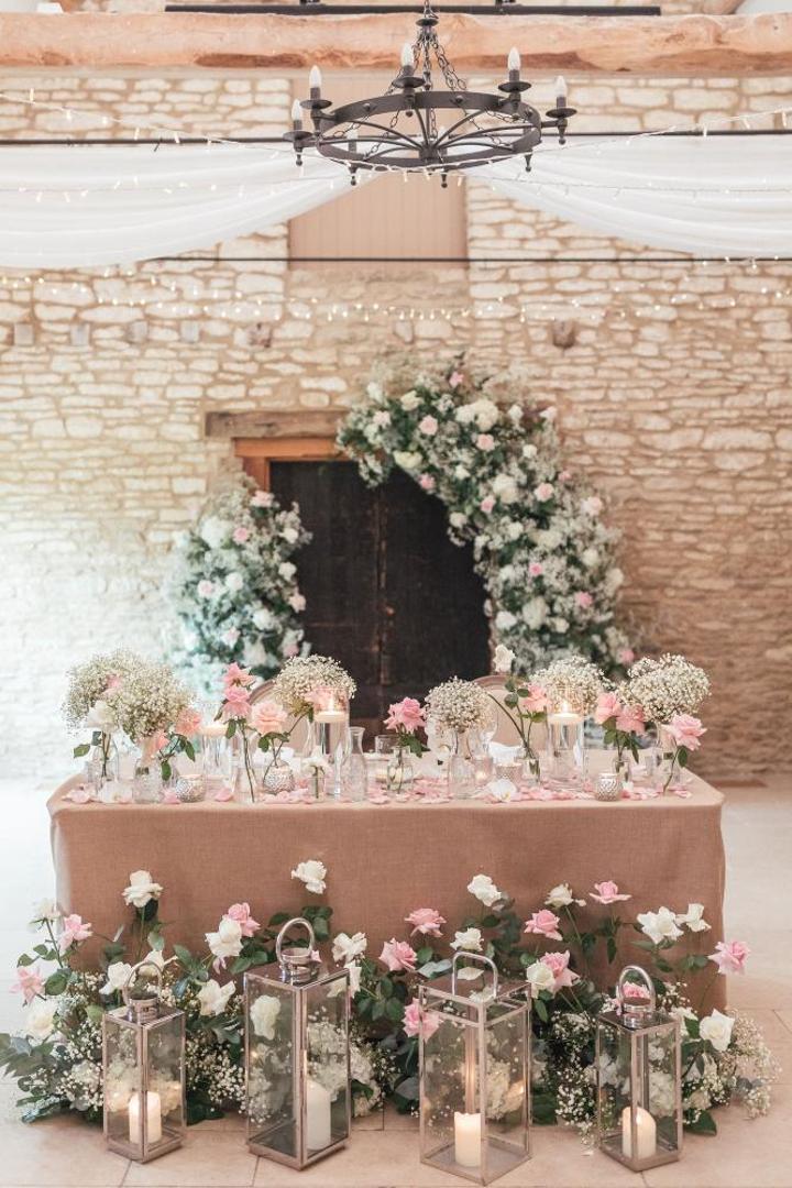 Working with our fabulous couple we designed a whimsical day with modern reflexed roses in blush pinks and clouds of ethereal gypsophilla.The ceremony had a magical aisle of floaty meadow gardens teamed with romantic candlelight from silver lanterns. A soft, over- sized broken arch framed the couple and was then used as a photo-backdrop. The elegant, long tables were decorated with canopies of gypsophilla and roses, single stem roses, petals and tealights decorated underneath the canopy.