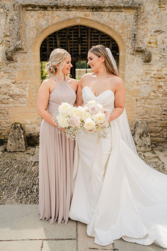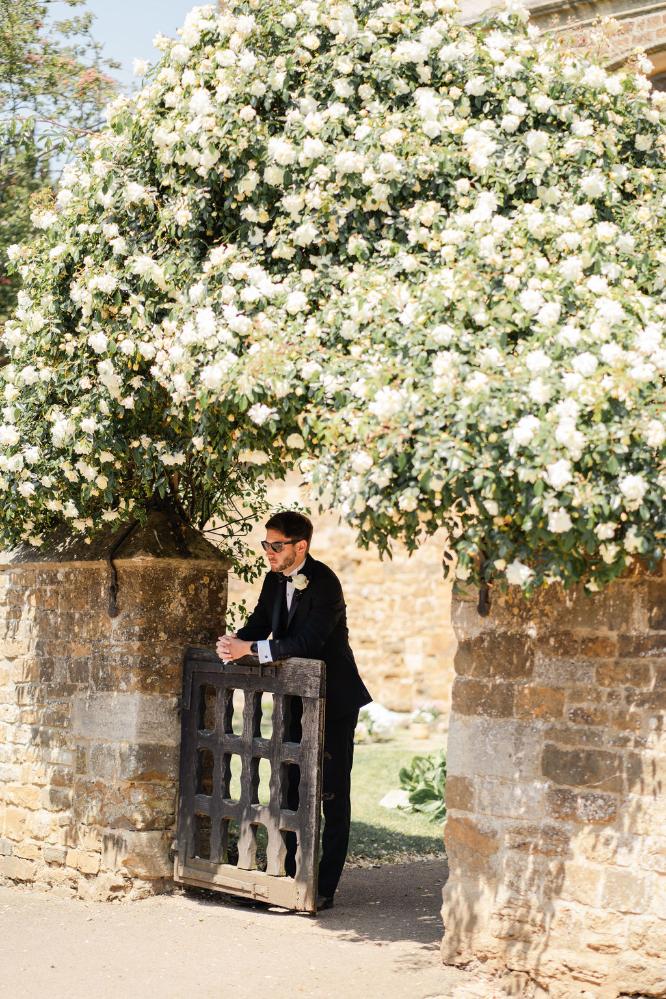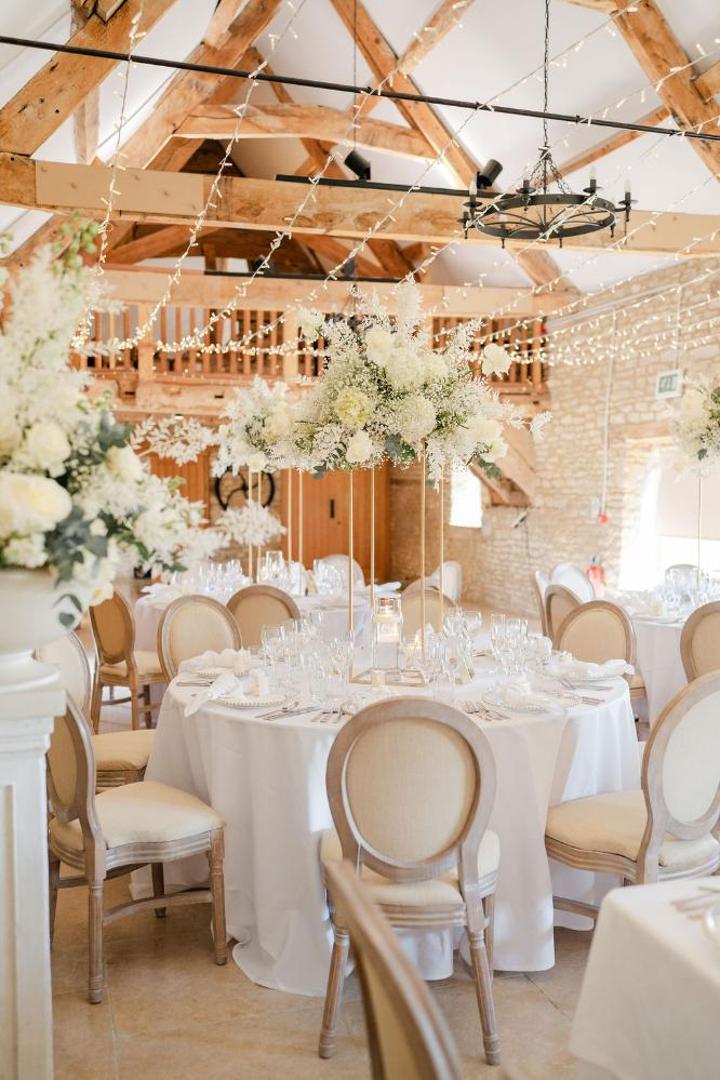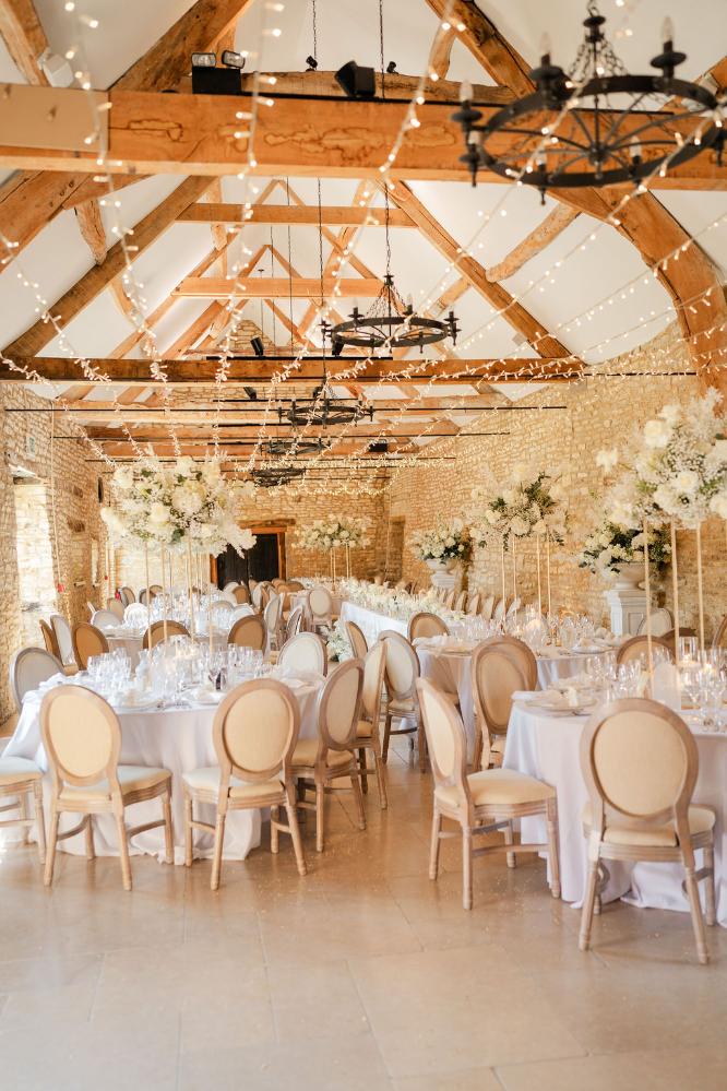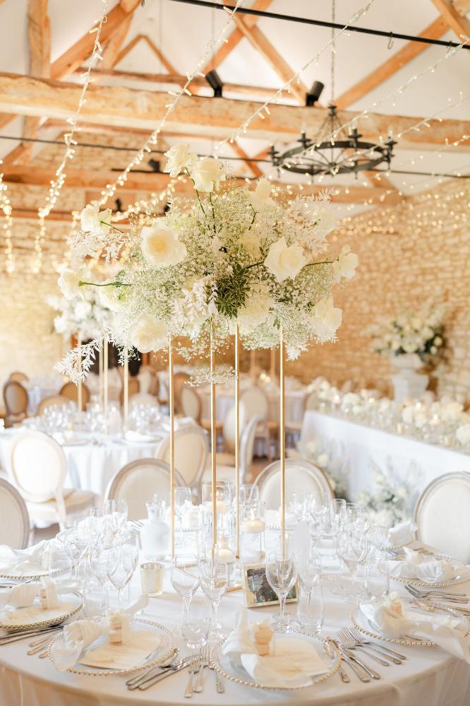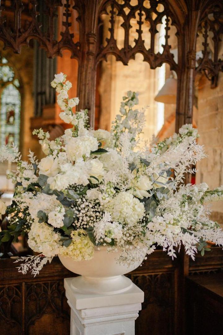 For this Cotswold wedding, working with our bride Charlotte, we chose a colour palette that was both classic and timeless – white. White flowers symbolise purity, new beginnings, and the purest form of love. In this idyllic setting, it was the ideal choice to create a romantic, ethereal ambiance.Charlotte came to us with a clear picture of what she wanted to achieve. We worked with her to make her dreams a reality with modern, reflexed roses, asymmetry and lots of romantic blooms. Sunning urns at the church framed the couple during the ceremony and then stunning tall, dramatic arrangements which work so well at Caswell House with its tall barn ceilings.