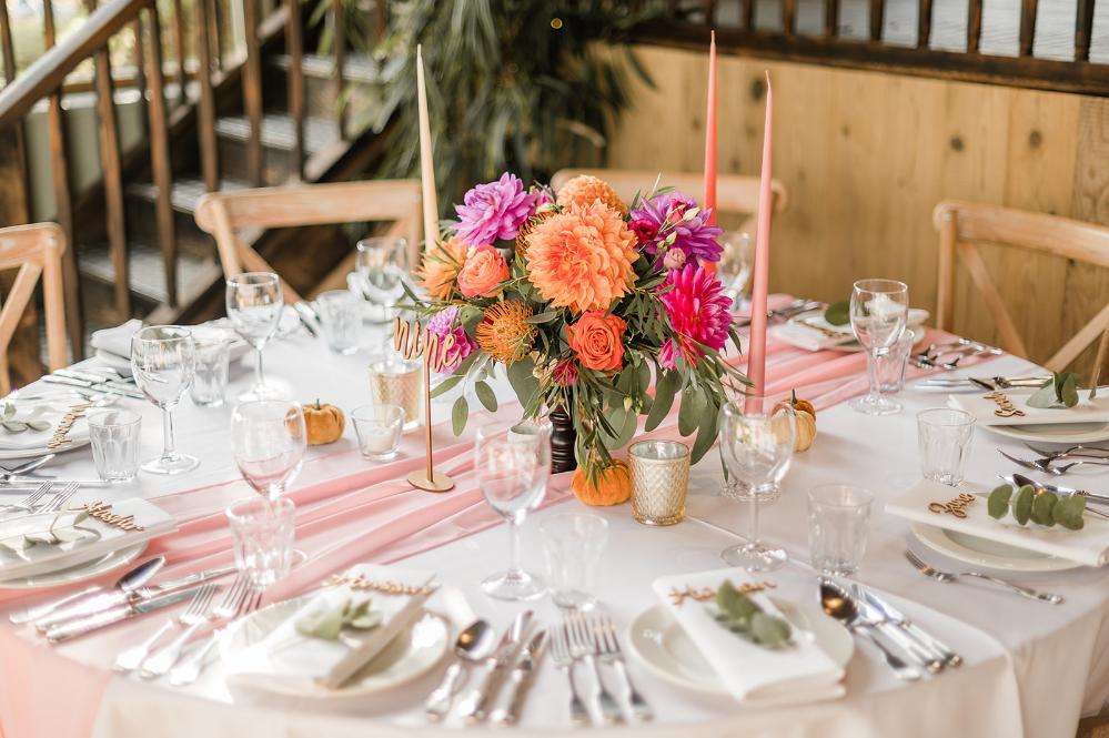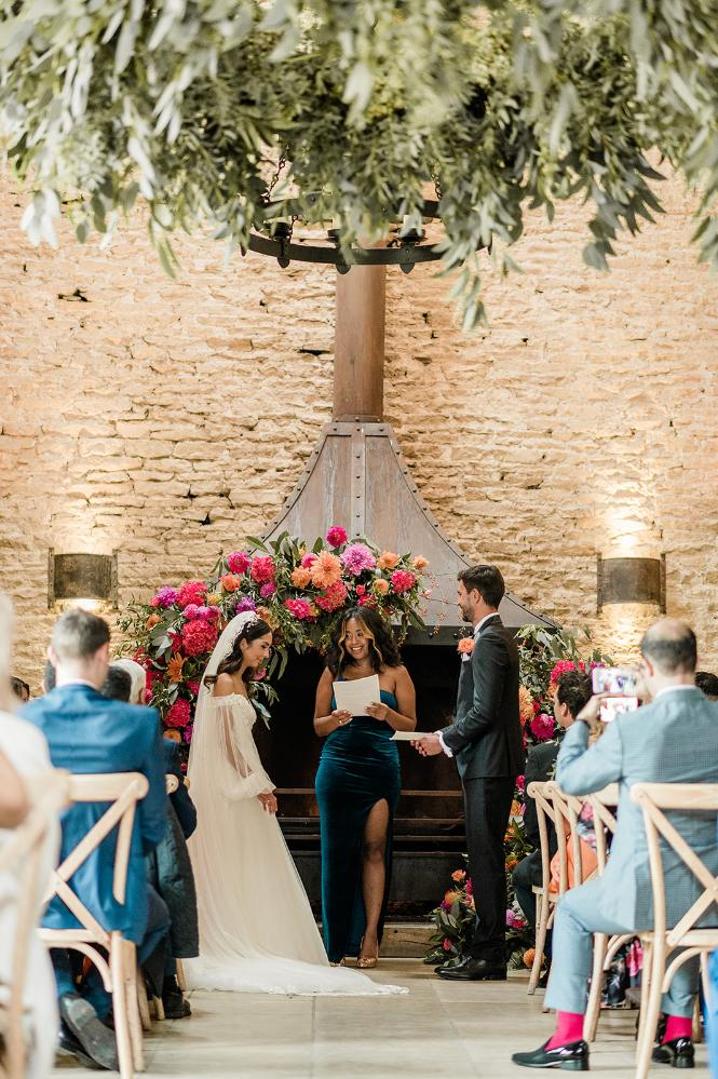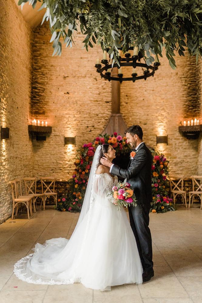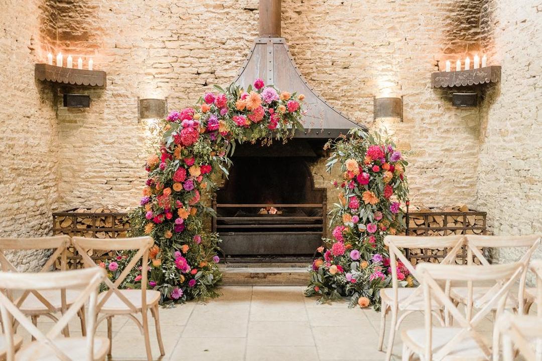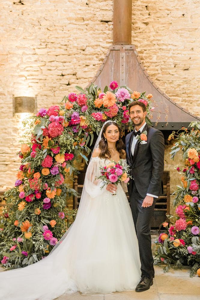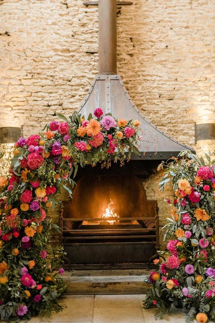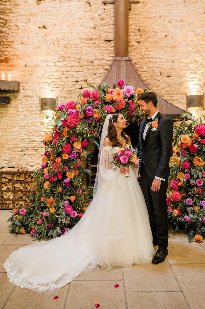 The moody romance of the venue with the bright colour pop of flowers