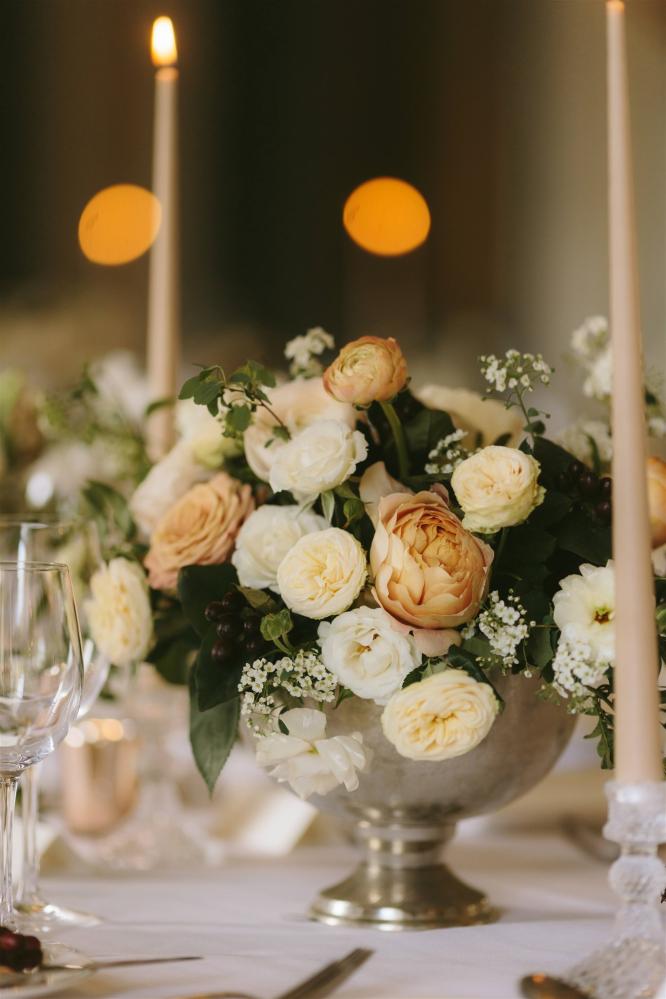 At the stunning Cliveden we designed a romantic tablescape of muted gold punch bowls and vases overflowing with English roses and sweet peas all reflecting the candlelight brief witjh lots of candles to finish the look of course!