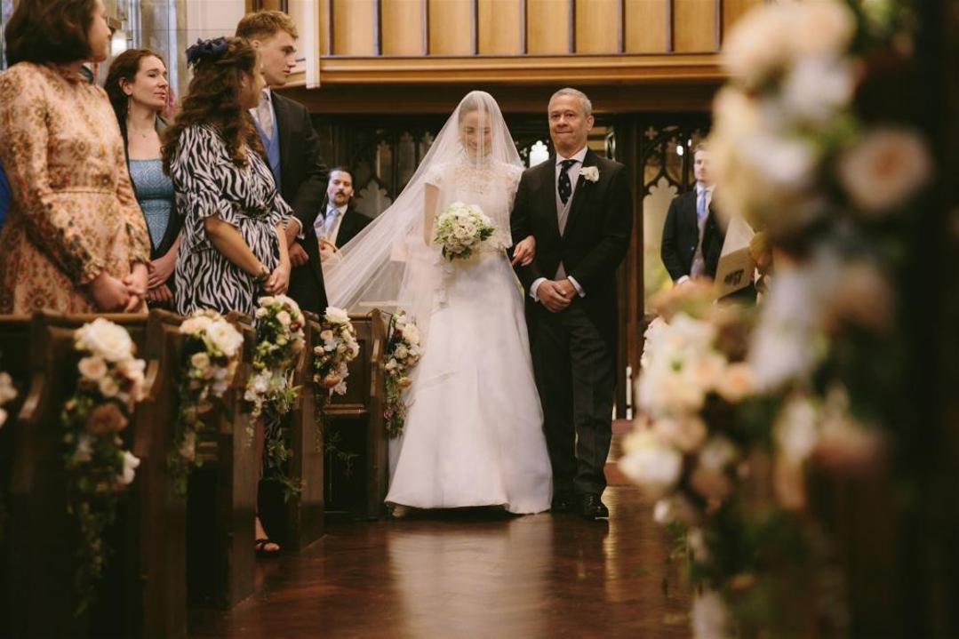 They were married in the centre of Oxford at St Michaels Church where we created long trailing pew ends and asymmetrical urns to frame them during the ceremony.