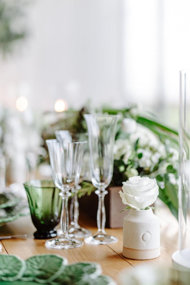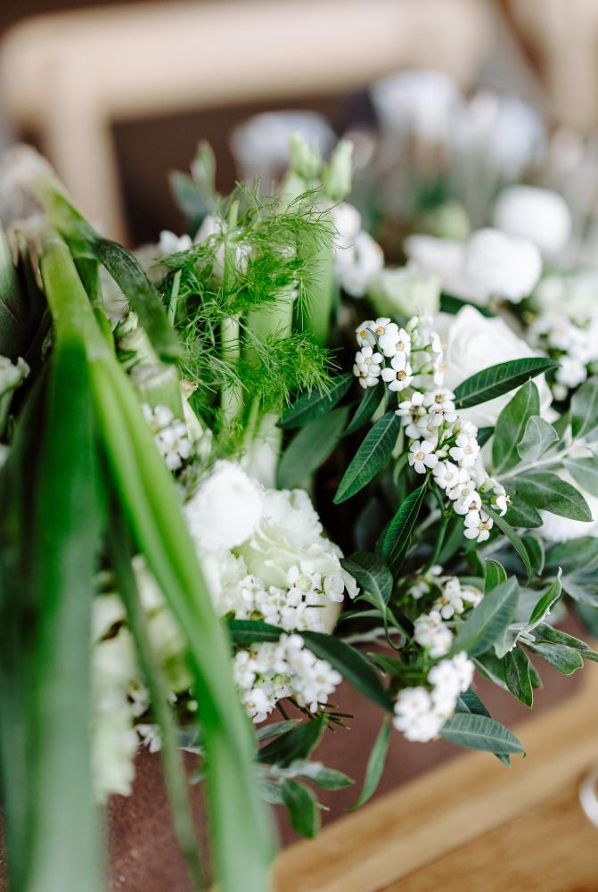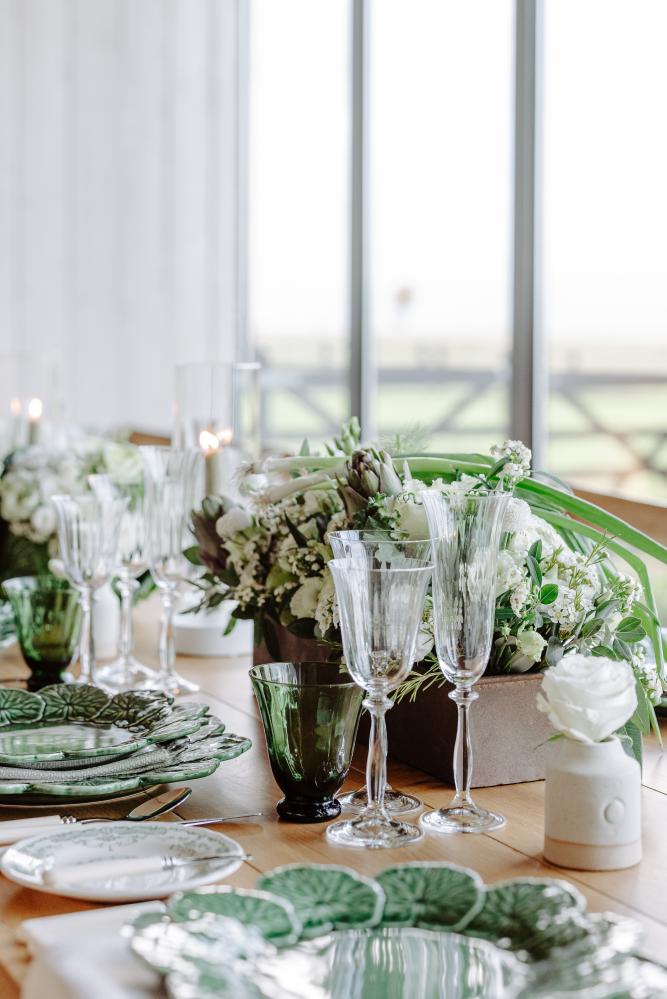 Our floral design for this shoot was centred around the freshness and vitality of spring. We envisioned a tablescape that felt effortlessly elegant, marrying crisp greens and soft whites to evoke the beauty of new growth and the season’s purity.