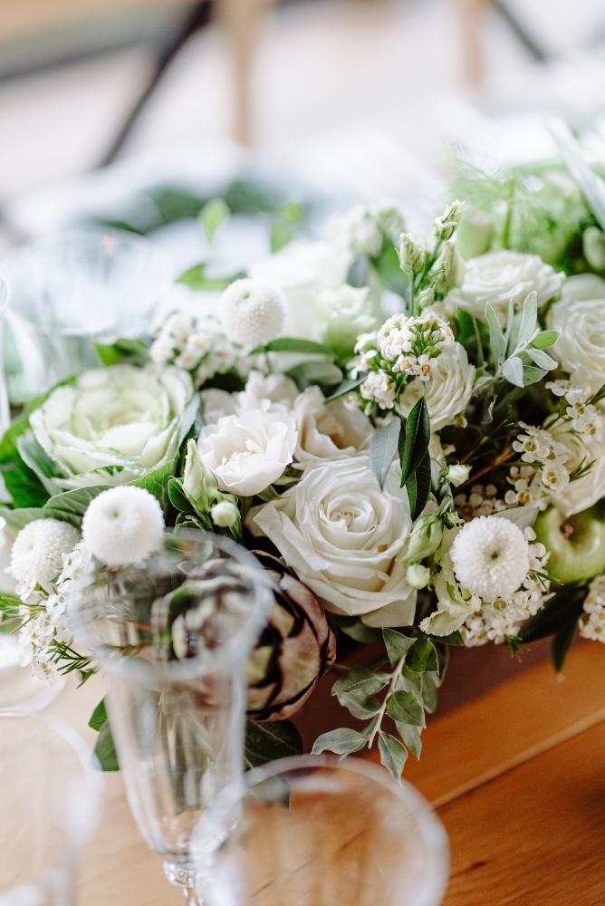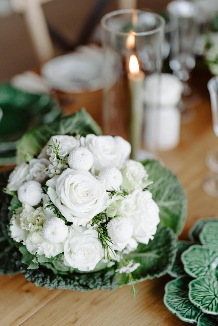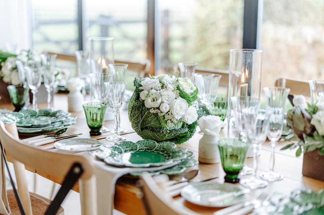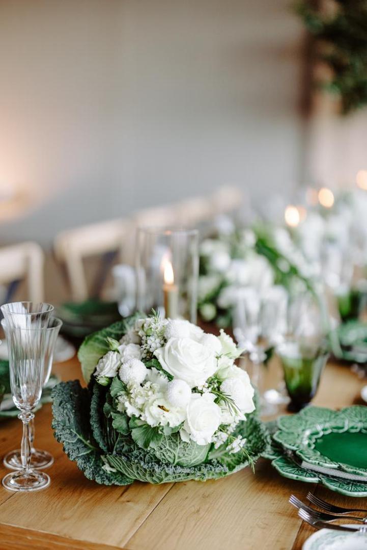 Flower-filled cabbages, which served as unique, eye-catching vessels for smaller floral displays, perfectly complementing the green tableware and adding a playful yet sophisticated touch.