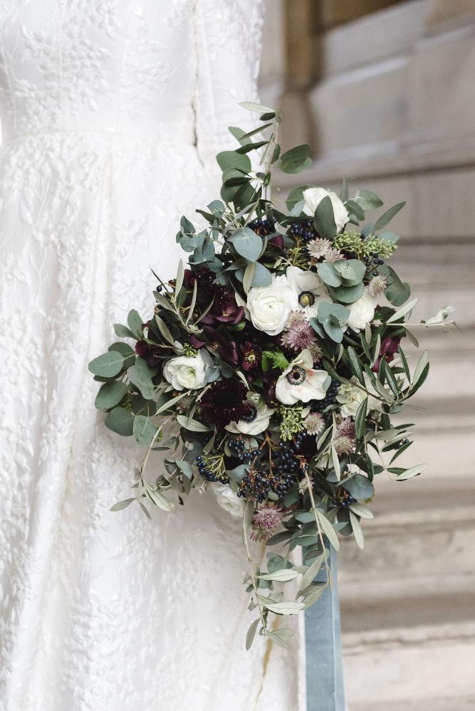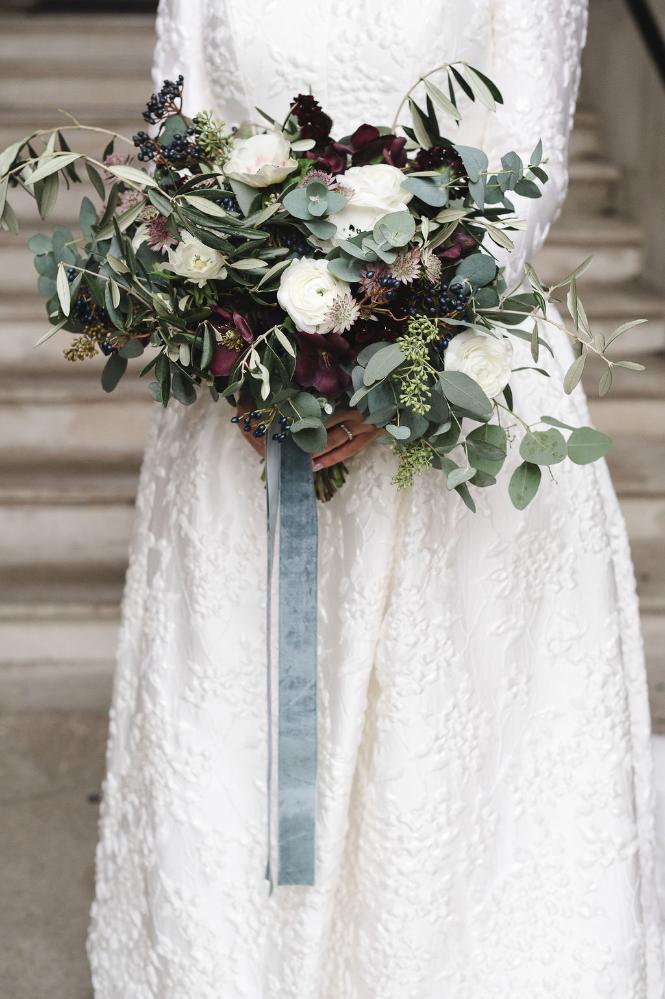 The floral designs brought a soft yet sophisticated touch to the day. Emma’s bouquet was a stunning cascade of deep burgundy blooms, ivory roses, and seasonal foliage. Eucalyptus, olive branches, and clusters of winter berries added texture and depth, creating a bouquet that felt both lush and natural. Long velvet ribbons in a soft grey-blue completed the look, adding a romantic, ethereal quality. For the reception, the florals took centre stage on long banquet tables adorned with white roses, hydrangeas, and an abundance of greenery.