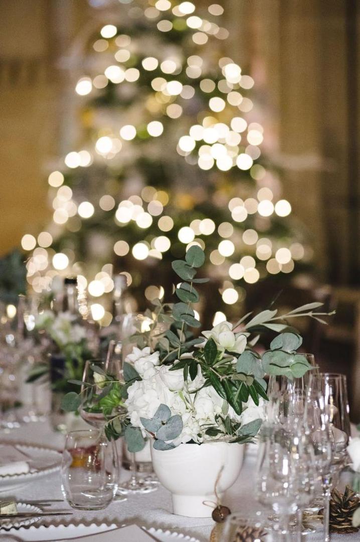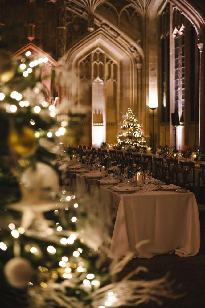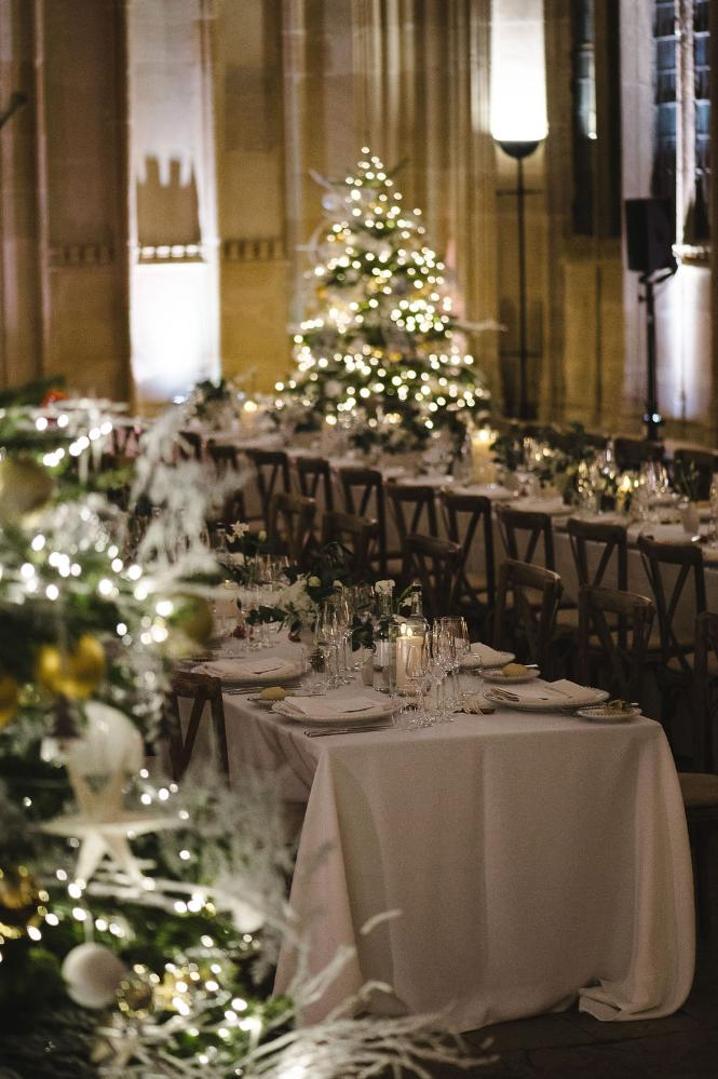 With Christmas just around the corner, the couple leaned into the festive spirit. Elegant Christmas trees decorated with golden baubles and frosted details framed the dining space, adding an air of seasonal magic. The soft glow of candlelight and the library’s vaulted ceilings created a cosy yet grand ambience that left guests in awe.